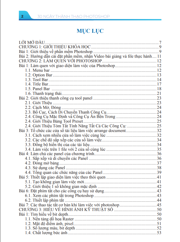Cuốn sách "30 Ngày Thành Thạo Photoshop - Cuốn 1: Làm Chủ Bộ Công Cụ" hướng dẫn người đọc cách sử dụng phần mềm Photoshop từ cơ bản đến nâng cao. Sách được chia thành nhiều chương, mỗi chương tập trung vào một khía cạnh khác nhau của Photoshop như giới thiệu phần mềm, làm quen với giao diện, các công cụ, và các nguyên lý thiết kế cơ bản.