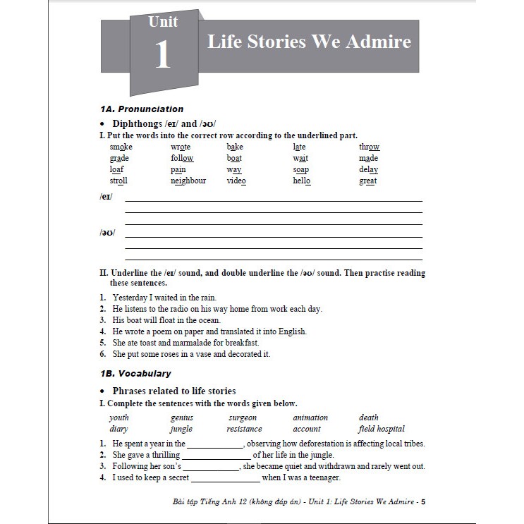 Các bài tập trong Bài tập Tiếng Anh 12 – Không đáp án đa dạng, phong phú, bám sát từ vựng, ngữ pháp và chủ đề trong sách giáo khoa Tiếng Anh – chương trình mới. Tác giả hi vọng rằng Bài tập Tiếng Anh 12 – Không đáp án sẽ là một tài liệu tự học hữu ích cũng như một phương tiện hỗ trợ tốt cho việc rèn luyện, nâng cao trình độ Tiếng Anh cho học sinh lớp 12.