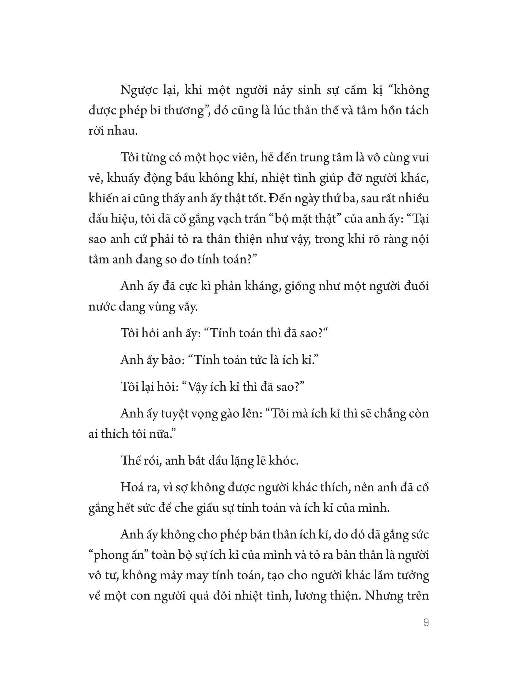 - Tích cực nhưng đừng tích cực độc hại! Từ nhỏ chúng ta đã được dạy rằng: cảm nhận tích cực là thứ an toàn, được yêu thích; còn cảm nhận tiêu cực là thứ nguy hiểm, không được chào đón. Chúng ta luôn sẵn lòng thể hiện ra mặt tốt, không bằng lòng thể hiện ra mặt xấu của bản thân: lúc nào cũng muốn tỏ ra vui vẻ chứ không thích để người khác thấy m.ình đang buồn; lúc nào cũng tỏ ra kiên cường, giấu nhẹm đi sự yếu đuối. Theo thời gian, chúng ta quên mất rằng thực ra m.ình cũng có nỗi đau, cũng có mặt yếu đuối. Ngay cả khi biết rõ điều đó, chúng ta cũng không chấp nhận nó, càng không muốn người khác biết về nó. Chúng ta đã quen với việc dành niềm vui cho người khác và giữ lại nỗi đau cho m.ình. Chúng ta cũng đã quen với việc dành sự kiên cường cho người khác, đồng thời giữ lại sự yếu đuối cho bản thân.