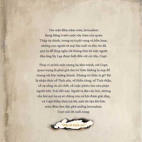 Thay vì sợ hãi một tương lai khó tránh, với Copt, quan trọng là phải giữ cho tri thức không bị sụp đổ chung với bức tường thành. Nhưng tri thức là gì? Đó là nhận thức về Tình yêu, về Hiến dâng, về Tinh thần, về sự sống và cái chết, về cuộc phiêu lưu của phận người trên Trái đất này. Người ta đặt câu hỏi, những câu hỏi mà họ sợ sẽ chẳng còn cơ hội được giải đáp, và Copt điềm tĩnh trả lời, mãi tới tận khi bức màn đêm đen đặc phủ xuống Jerusalem. Copt nói lời cuối cùng: