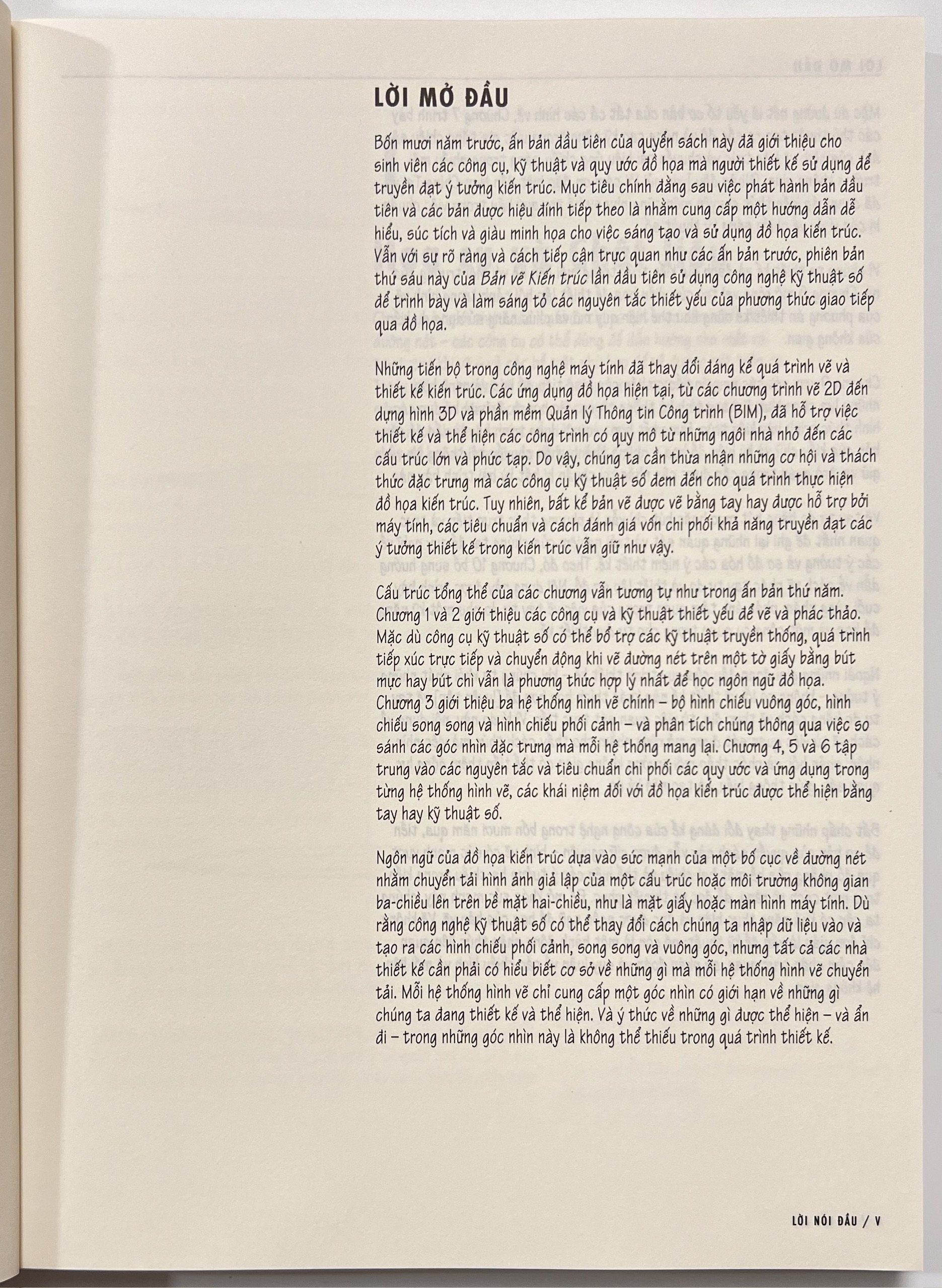 Tựa sách Bản vẽ Kiến trúc cung cấp các công cụ, nguyên tắc, và kỹ thuật vẽ quan trọng mà các nhà thiết kế sử dụng để diễn giải các ý tưởng kiến trúc thành các bản trình bày một cách hiệu quả và trực quan.