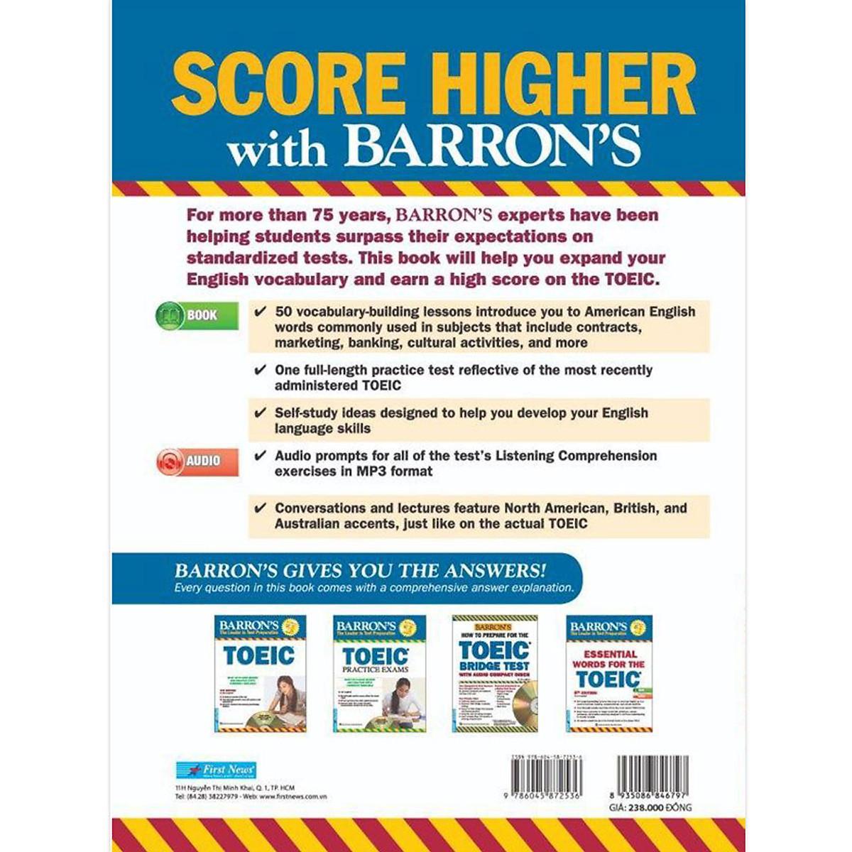 Essential words for TOEIC (Tái bản lần thứ 6) là cuốn sách giúp người học xây dựng vốn từ vựng, tập trung vào 600 từ vựng Anh - Mỹ thường xuất hiện trong kỳ thi TOEIC. Từ vựng và cách dùng từ là những gì mà quyển sách này hướng đến để giúp bạn chuẩn bị tốt cho kỳ thi TOEIC (Kỳ thi Trắc nghiệm tiếng Anh trong giao tiếp quốc tế). Đây là kỳ thi nhằm đánh giá trình độ tiếng Anh của những người làm việc trong lĩnh vực kinh doanh quốc tế, hoặc dự định sử dụng tiếng Anh để giao tiếp. Dù kỳ thi TOEIC không nhằm trắc nghiệm vốn từ chuyên môn nhưng các câu hỏi trong bài thi đều nằm trong những ngữ cảnh đặc trưng. Quyển sách này sẽ giúp bạn nắm vững những ngữ cảnh đặc trưng thường gặp trong bài thi TOEIC. Mỗi chương giới thiệu một ngữ cảnh cụ thể đã từng có trong bài thi. Những từ mới được giới thiệu trong mỗi chương đều nằm trong vốn từ vựng thông dụng nên có thể được dùng trong nhiều ngữ cảnh khác nhau. Nhờ đó, bạn sẽ dễ dàng nắm được nghĩa của những từ này trong những ngữ cảnh của đề thi TOEIC. Ở phần cuối sách, giới thiệu một đề thi TOEIC mẫu để bạn có cơ hội ôn luyện vốn từ vựng theo ngữ cảnh của đề thi TOEIC. Đây là đề thi đúng chuẩn TOEIC với những dạng câu hỏi cũ và bổ sung một số dạng câu hỏi mới đang bắt đầu được sử dụng ở một vài quốc gia. Ngoài nội dung chính cuốn sách còn hướng dẫn cách sử dụng khoa học, dễ hiểu và hiệu quả. Bao gồm 50 bài học, trong mỗi bài học, bạn sẽ học được 12 từ mới qua từng ngữ cảnh cụ thể. Nếu bạn học mỗi ngày một bài, thì sau 50 ngày, bạn sẽ học thêm được 600 từ mới. Bạn sẽ luyện tập những từ mới học bằng cách làm các bài tập được mô phỏng giống như bài thi TOEIC. Ở trang đầu của mỗi bài học, bạn sẽ thấy một khung chữ nhật - phần danh mục từ, trong đó có 12 từ vựng. Mỗi từ sẽ có định nghĩa và hai câu ví dụ có chứa từ đó trong 2 ngữ cảnh khác nhau. Mục đích của trang này là giúp: