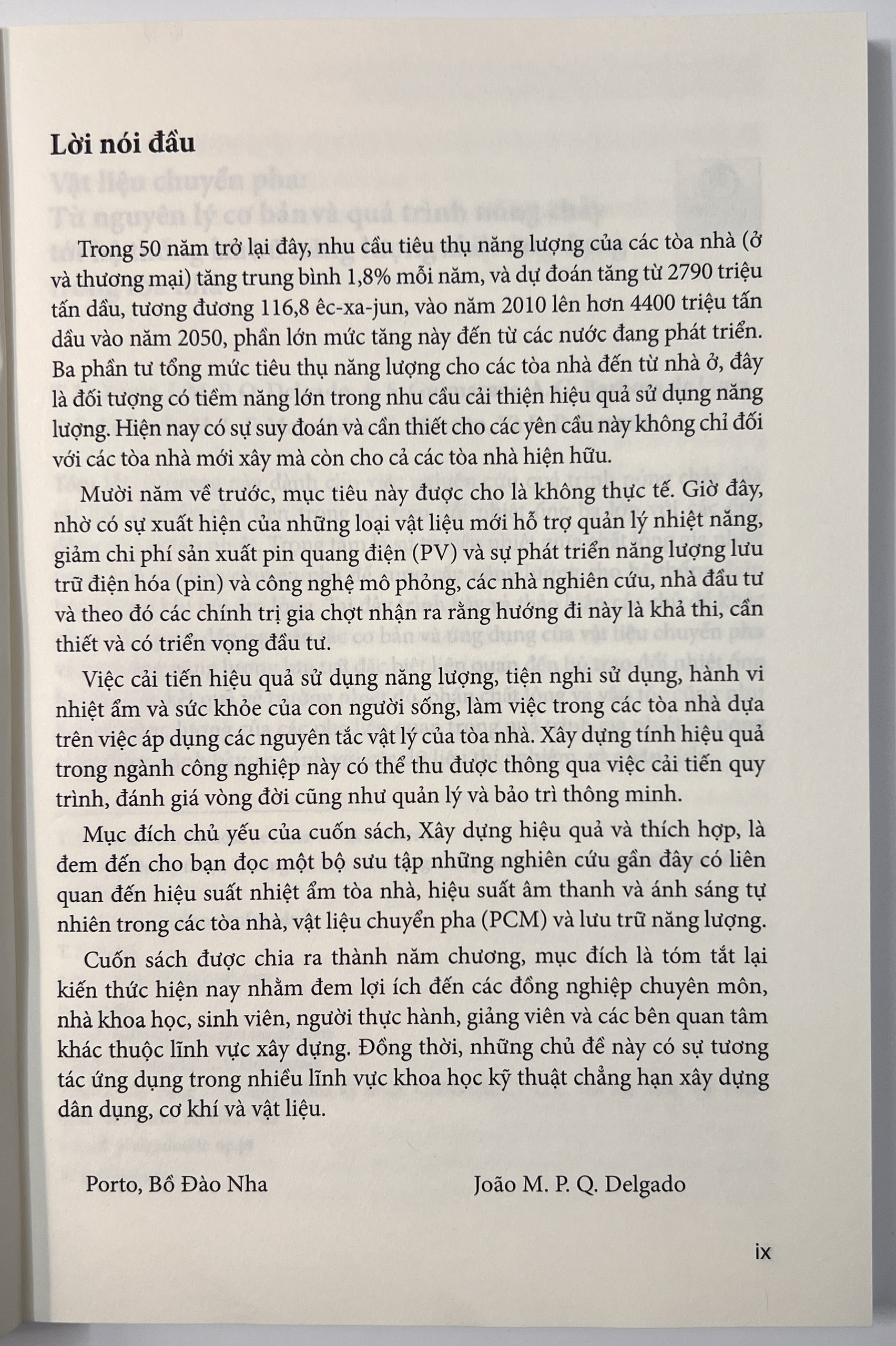 Mục đích chủ yếu của cuốn sách, Xây dựng hiệu quả và thích hợp, là đem đến cho bạn đọc một bộ sưu tập những nghiên cứu gần đây có liên quan đến hiệu suất nhiệt ẩm tòa nhà, hiệu suất âm thanh và ánh sáng tự nhiên trong các tòa nhà, vật liệu chuyển pha (PCM) và lưu trữ năng lượng.