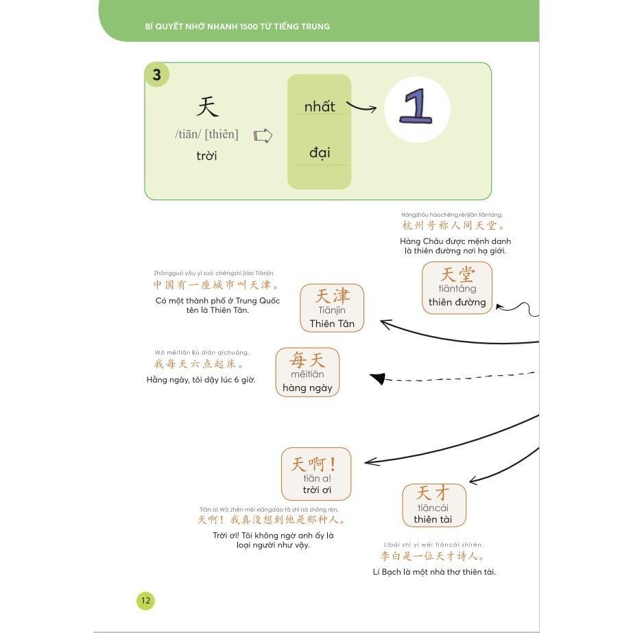 "Bí quyết nhớ nhanh 1500 từ vựng tiếng Trung và nhớ nhanh 1500 chữ Hán và các mẫu câu thông dụng" dựa trên phương pháp mở rộng từ ngữ theo sơ đồ tư duy hiệu quả, từ một từ gốc triển khai ra các từ vựng rồi kết hợp với đặt câu.