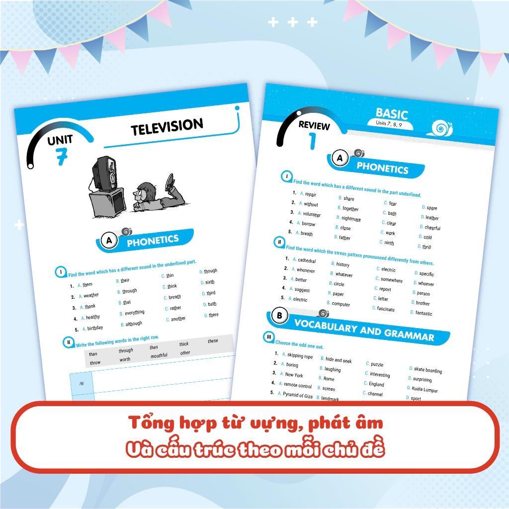 - Bài tập rèn luyện đa dạng, cơ bản và nâng cao Bài tập được phân chia theo 2 cấp độ, cơ bản và nâng cao. Hệ thống bài tập luyện 4 kỹ năng cơ bản giúp các em ôn tập kiến thức trên lớp; bài tập mở rộng, nâng cao để các em rèn luyện và làm quen với các kì kiểm tra, đánh giá. Các bài tập về 4 kỹ năng được liên kết với nhau theo logic bài học giúp cảm em cảm thấy tự tin và phát triển toàn diện kỹ năng nghe, nói, đọc, viết tiếng Anh