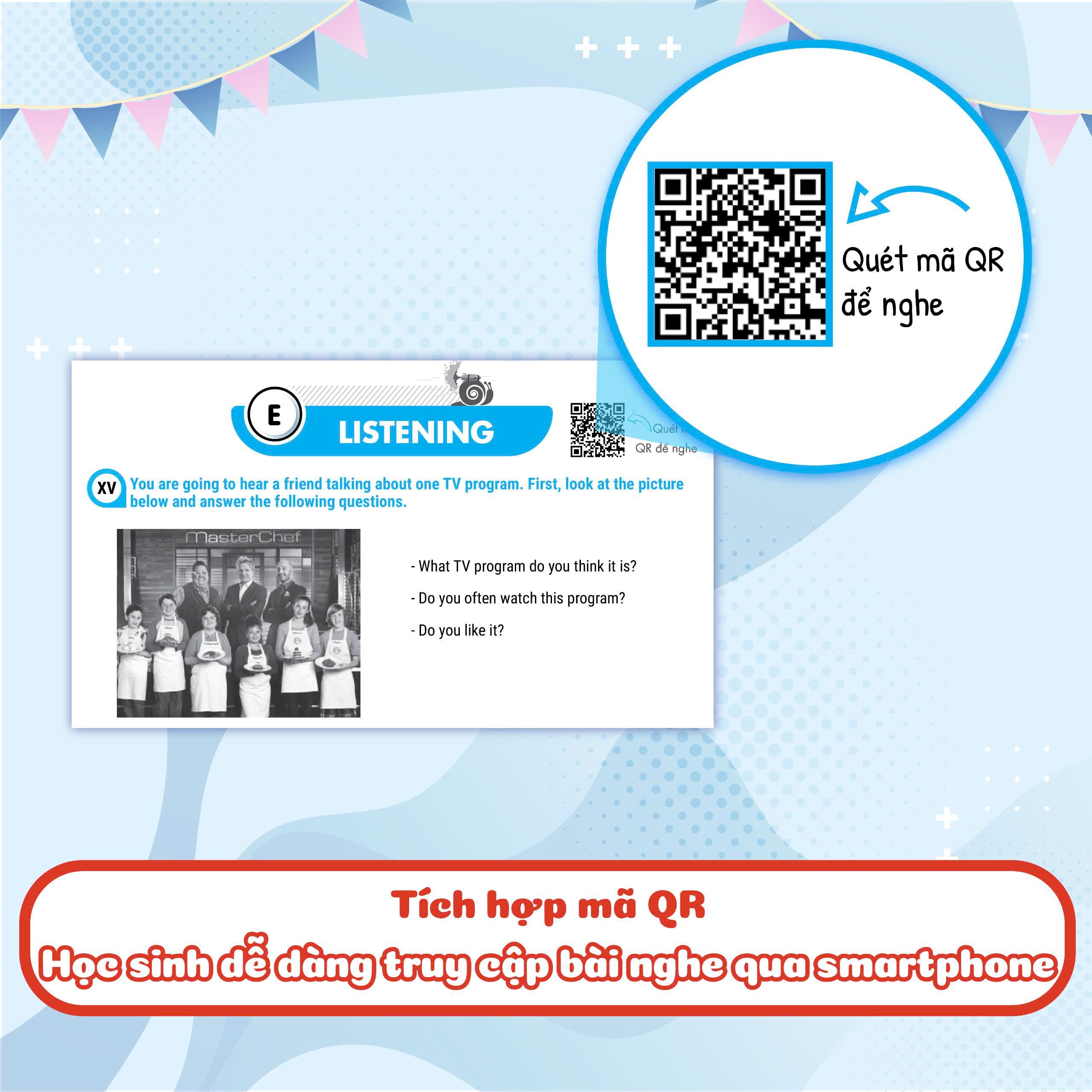 - File nghe code hiện đại và tiện dụng Một điểm đặc biệt của bộ sách đó là tính hiện đại và sự tiện dụng khi các em không cần sử dụng CD để có được bài nghe. Bộ sách được tích hợp mã và mã Code giúp các em dễ dàng có được file nghe chỉ với 1 chiếc smartphone, giúp rút ngắn thời gian tìm file