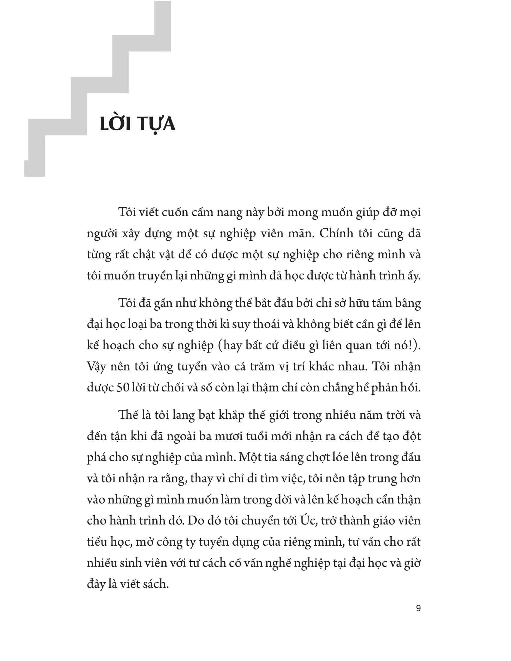Tìm kiếm một sự nghiệp thành công và viên mãn sau khi tốt nghiệp đại học là một việc đầy khó khăn, bởi có quá nhiều con đường để lựa chọn và quá có nhiều yếu tố phải cân nhắc. Dẫu vậy, bạn không cần cảm thấy choáng ngợp. Khi bạn đã vạch ra một kế hoạch và đi những bước đầu tiên, mọi chuyện thường sẽ tự đâu vào đấy. Dĩ nhiên là đôi lúc bạn sẽ chọn sai và đi vào ngõ cụt, nhưng nếu bạn có thể biến mỗi trải nghiệm thành một cơ hội để hiểu thêm một chút về bản thân và công việc mà bạn muốn làm, thì bạn sẽ ổn thôi.