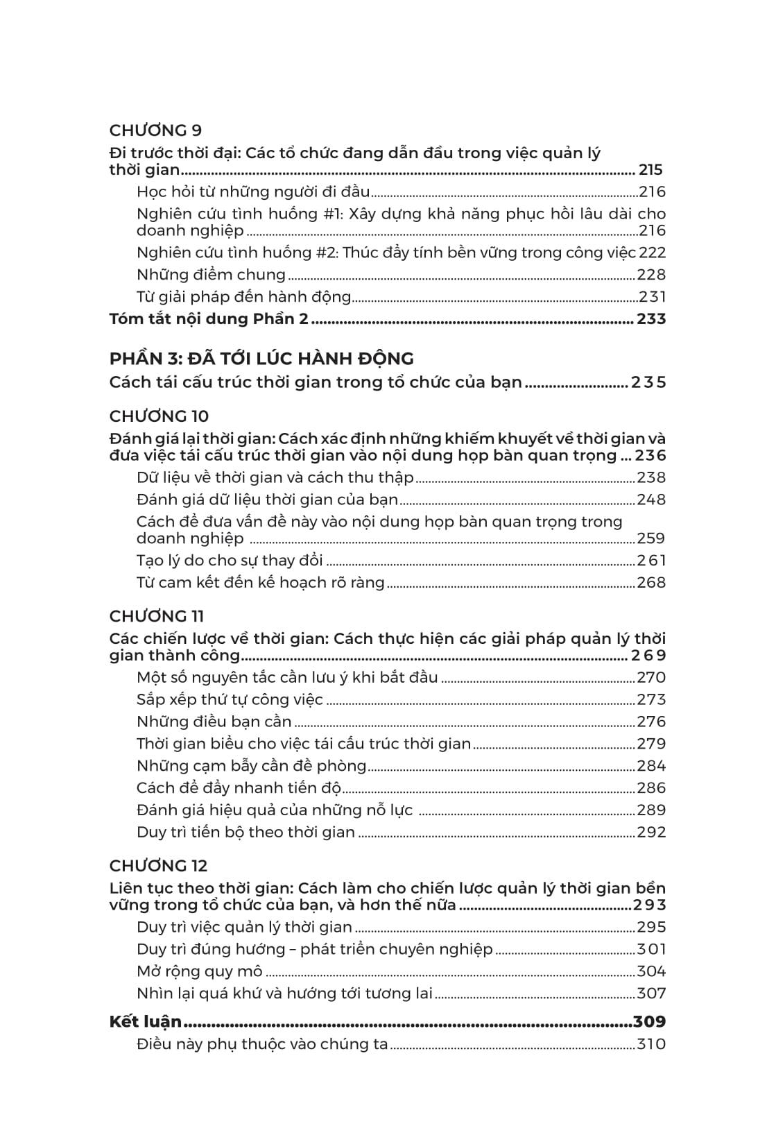 Sang phần thứ hai, “Tái cấu trúc thời gian”, cuốn sách chuyển từ chẩn đoán sang hành động. Helen Beedham vẽ nên bức tranh về một tổ chức “chủ trọng thời gian” – nơi các quyết định không xoay quanh số giờ làm việc mà tập trung vào kết quả, nơi công việc được thiết kế có chủ đích và nhân viên được trao quyền tự chủ.