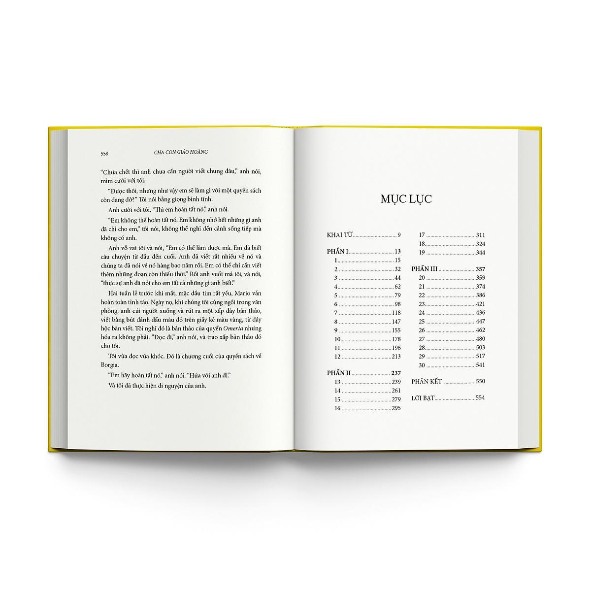 Cha con Giáo hoànglà một thiên sử thi xuất sắc, pha trộn màu sắc lãng mạn với chất cuồng điên của lòng tham quyền lực, những mưu ma chước quỷ, tội lỗi và trừng phạt… vượt xa khỏi trí tưởng tượng của người thường. Cuốn sách mang người đọc du hành đến một không gian, thời gian hoàn toàn khác, nơi Giáo hội nắm quyền thống trị tối cao, nơi lửa tham vọng ngùn ngụt cháy dưới tấm áo choàng đỏ rực. Đây là câu chuyện về mối quan hệ cha con kì lạ: gắn bó với nhau bởi huyết thống, lòng tận tụy và những ý đồ đen tối; về một gia đình khét tiếng mà công trạng và tội lỗi còn mãi lưu truyền hậu thế: gia đình Borgia.
