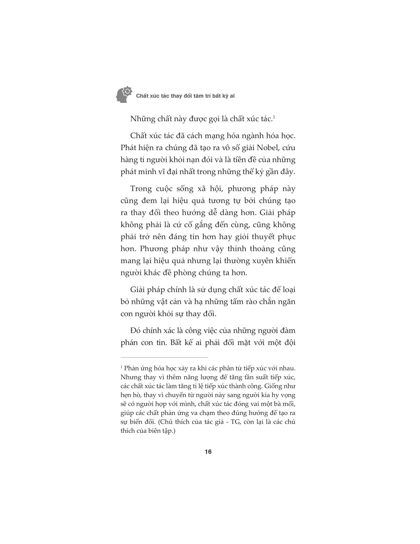 Chất Xúc Tác Thay Đổi Tâm Trí Bất Kỳ Ai Mỗi người đều có thứ họ muốn thay đổi. Người bán hàng muốn thay đổi suy nghĩ của người mua. Nhân viên muốn thay đổi góc nhìn của sếp, lãnh đạo thì muố...