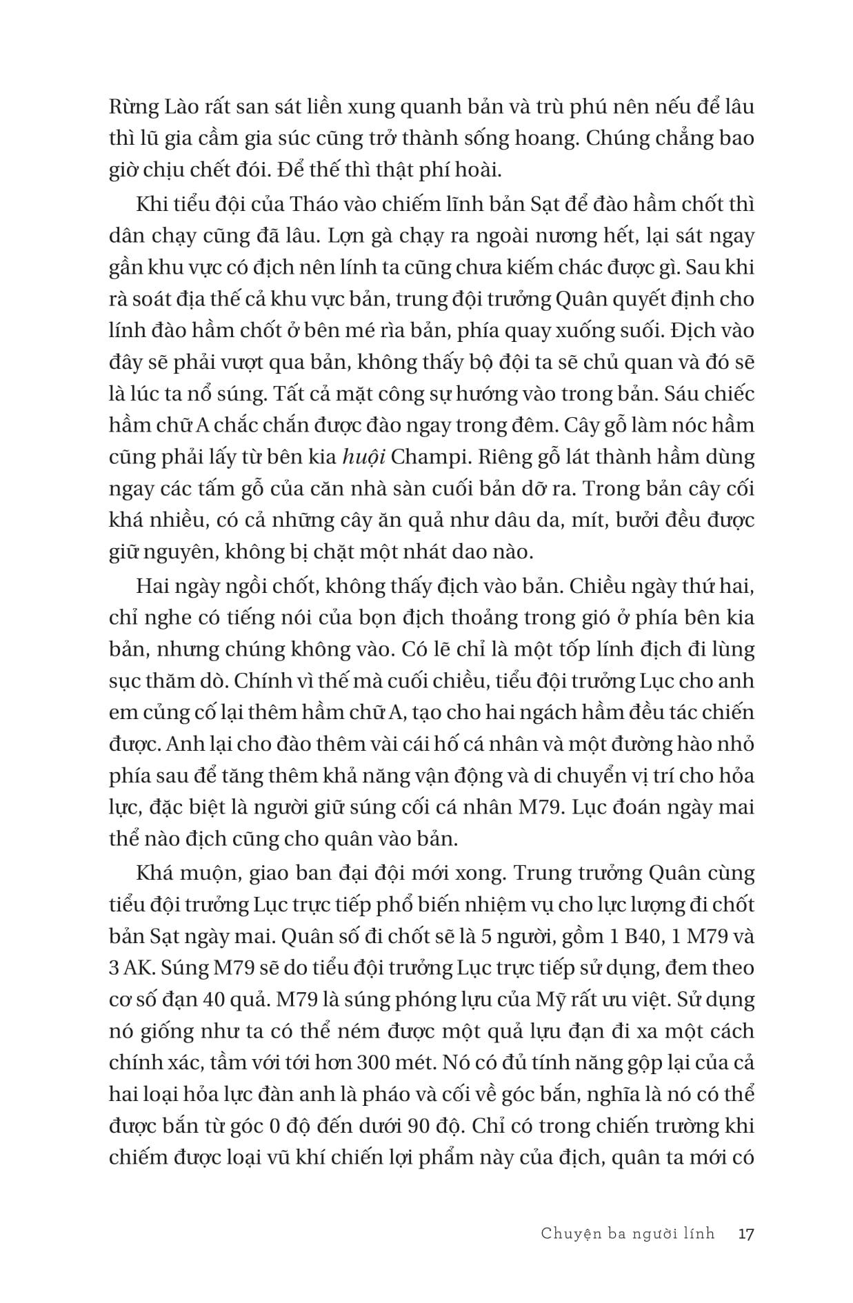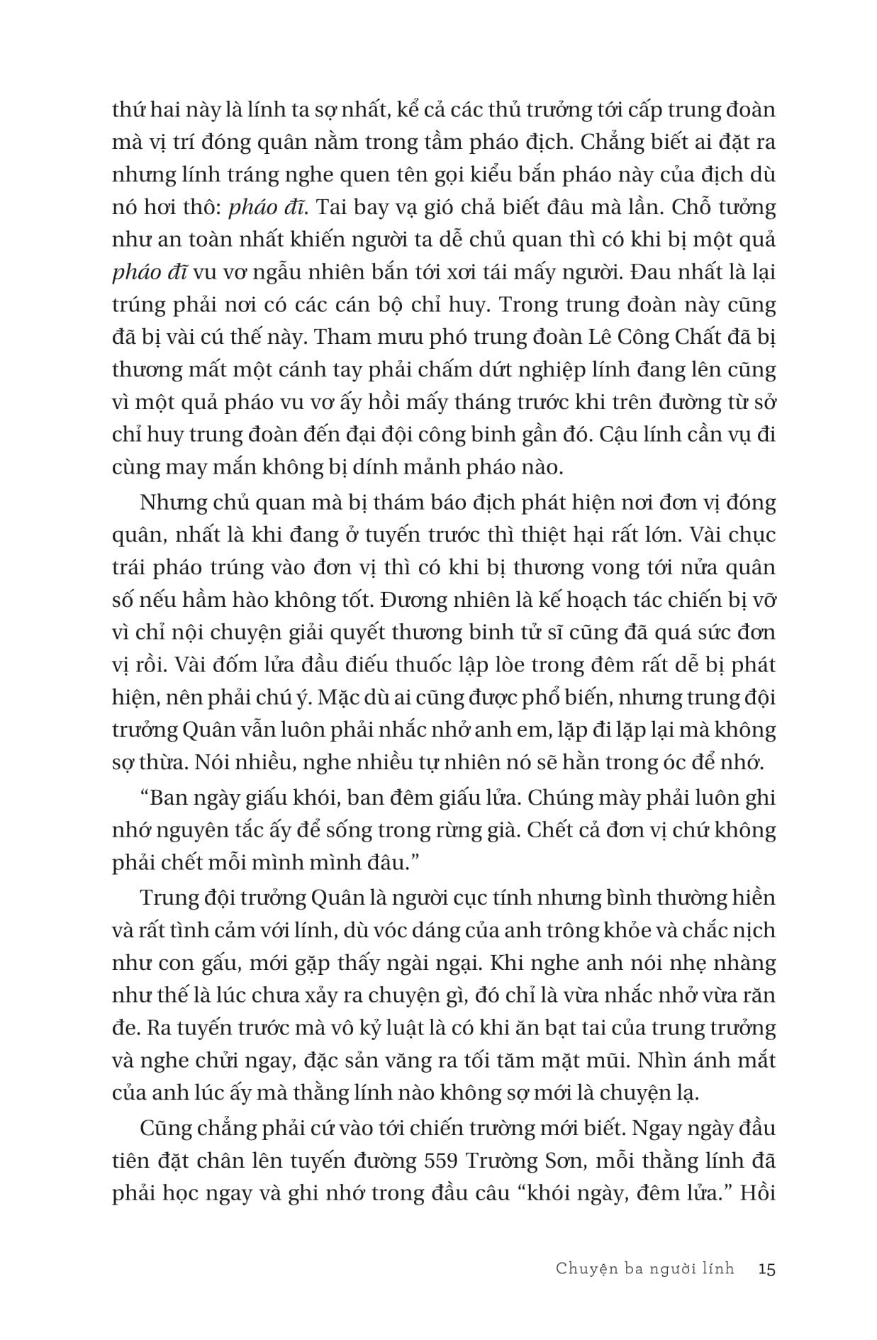 Giống như nhiều tiểu thuyết hoặc phim chiến tranh, Chuyện ba người lính được kể lại bám theo cuộc đời quân ngũ của một tân binh từ ngày nhập ngũ cho đến hết chiến tranh. Cùng đơn vị của m.ình, anh đã sống và chiến đấu từ chiến trường Lào sau Hiệp định Paris đến chiến trường Tây nguyên và giải phóng Sài gòn trong chiến dịch Hồ Chí Minh. Thế giới của những người lính được quan sát từ điểm nhìn của người tân binh có số phận đặc biệt này: xuất thân là một thanh niên làm nghề tự do ở một làng ngoại thành Hà Nội. Chuyện ba người lính không chỉ tái hiện lại thế giới của chiến trận, cách người lính sống và chiến đấu, sự hy sinh và cả cách họ sống sót qua những khốc liệt của chiến trường và những thiếu thốn không thể tưởng tượng được trong thời bình. Truyện kể dựng lên một thế giới nhân vật và số phận rất đa dạng và không kém phần độc đáo, từ một người sĩ quan huấn luyện chuyên làm nhiệm vụ dẫn tân binh từ miền Bắc vào giao cho những đơn vị chiến đấu ở các chiến trường miền Nam đến một người lính nhập ngũ chỉ với một khao khát duy nhất là để em trai ở nhà được đi học đại học. Đó là thế giới mà con người phải sống, nương tựa vào nhau và nương tựa vào thiên nhiên để tồn tại, một thế giới mà bất cứ khoảnh khắc nào cái chết cũng chờ chực và thường xuất hiện không báo trước, đến mức trở thành một điều bình thường trong cuộc sống của người lính. Trong thế giới ấy cái đói, nỗi sợ hiện lên một cách cụ thể và sống động và niềm hạnh phúc đôi khi vô cùng đơn giản: được ăn thêm vài lạng gạo trong một ngày. Không những thế, qua điểm nhìn của người lính còn phản chiếu cả hình ảnh của xã hội miền Bắc những năm 60, 70 của thế kỉ trước: phong trào hợp tác hoá; những biến chuyển của một xã hội nông thôn từ kháng chiến chống Pháp với rất nhiều thứ cơ chế mà đôi khi, sự lạm quyền có thể hoành hành và giết chết không ít số phận; cách người nông dân đi qua những ngặt nghèo của lịch sử và tìm một khoảng không gian tồn tại cho m.ình ngoài hợp tác xã; chủ nghĩa lí lịch và những hậu quả khủng khiếp của nó; bi kịch của những người ở hậu phương...a