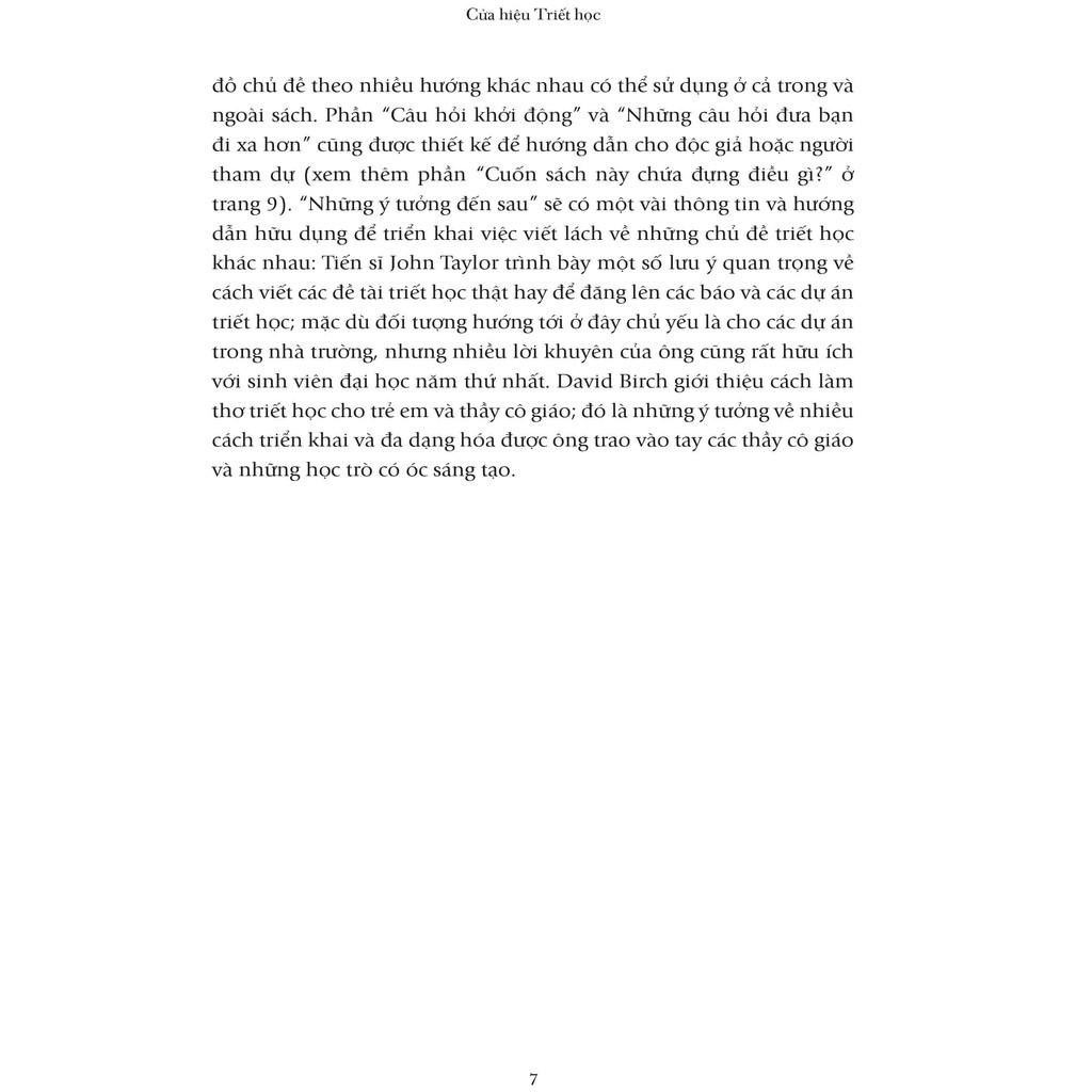 Cửa hiệu Triết học là một cửa hàng thực sự của những câu đố và thách thức triết học để phát triển tư duy trong và ngoài lớp học. Triết gia Socrates đã bày ra một kiểu trao đổi hoàn toàn khác, tiền của ông là các ý tưởng. Cửa hiệu sẽ đóng vai trò như Socrates đang nói chuyện với người đọc: có lúc lôi cuốn, khôi hài và hứng khởi; có lúc chọc ngoáy như một kẻ ưa châm chích, khiến chúng ta không yên; cũng có lúc nói lòng vòng phát ngán hay bỏ lửng, nhưng luôn kích thích suy nghĩ của mọi người.