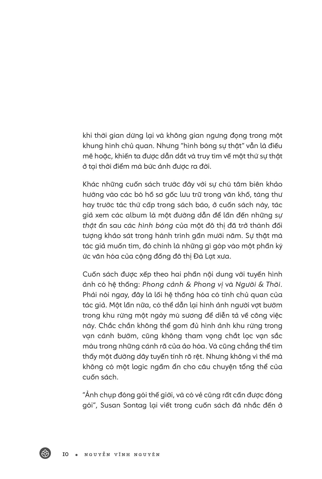 Bằng đường dây hình ảnh từ các album gia đình của người Đà Lạt và những kho ảnh của giới sưu tập, tác giả dẫn dắt người đọc đi vào không gian và thời gian của một đô thị thư nhàn, thanh tao và tự tại trong quá khứ. Bối cảnh những cuộc chuyển dịch lớn diễn ra qua phong cảnh, phong vị, tâm thế con người và tông màu thời cuộc được tác giả nắm bắt, thể hiện với một lối văn khảo và luận từ tốn, chăm chút và gợi mở.