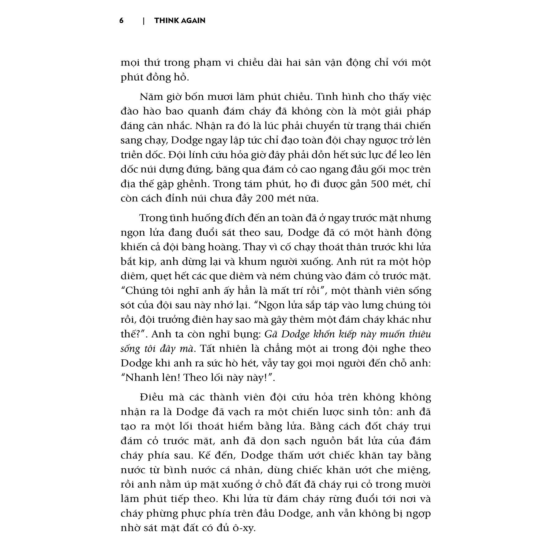 - Sức mạnh của việc biết mình không biết- Mười hai trong số mười lăm thành viên đội cứu hỏa đã tử nạn trong đám cháy gần đỉnh Mann Gulch vào năm 1949. Hai trong số ba người sống sót là nhờ có thể lực tốt nên kịp chạy thoát khỏi đám cháy; người còn lại, Wagner Dodge, đã thoát khỏi lưỡi hái tử thần bằng tư duy linh hoạt của mình. Những đồng đội của Wagner Dodge mất mạng vì đã hành động theo những kỹ năng và hiểu biết đã ăn sâu trong tiềm thức của họ. Dodge thì khác, anh không tìm cách dập lửa theo kiến thức tích lũy được, mà nhanh chóng nhận định tình hình và tạo ra một lối thoát hiểm bằng cách đốt trụi đám cỏ trước mặt, chặn đứng nguồn bắt lửa của đám cháy phía sau. Tưởng rằng đó là hành động điên rồ, nhưng Dodge đã thoát chết nhờ kịp thờitái tư duy. Táitưduy, theo Adam Grant, là suy nghĩ lại, cân nhắc lại quan điểm, định kiến, thậm chí là kiến thức của bản thân, cũng có thể là suy nghĩ thoát khỏi lối mòn tư duy. Cũng theo ông, để chinh phục kỹ năng này, bạn cần quên đi những gì đã học, đồng thời thiết lập và duy trìvònglặptáitưduy. Trong một thế giới đầy biến động, lối tư duy cố hữu và hiểu biết ăn sâu của chúng ta có thể trở thành lời nguyền án ngữ mọi sự tiến bộ của chính mình. Hơn thế nữa, bạn dễ đi thụt lùi vì“thiếu năng lực siêu nhận thức, tức là khả năng tư duy về cách tư duy của chính mình”, tác giả Adam nhận định.“Dám nghĩ lại”(Think Again) là cuốn sách sẽ hướng dẫn chúng ta từ bỏ việc bám chấp vào những hiểu biết của bản thân để tư duy cởi mở và linh hoạt hơn. Qua 11 chương sách, độc giả được Adam Grant dẫn dắt qua những cột mốc trên chặng đường khám phá kỹ năngtái tư duy. Từ xuất phát điểm là “chọn sự nhàn hạ của việc giữ nguyên những nhận thức thay vì vật lộn với những cái mới”, bạn sẽ từng bước sẵn sàng cập nhật quan điểm của bản thân, khai mở tư duy của người khác để cùng tạo ra những cộng đồng học tập suốt đời. Sau cùng, Adam Grand muốn hướng bạn đọc đến hành trình tự suy xét lại các kế hoạch của bản thân để từ đó, đưa ra được những quyết định đúng đắn. Đặc biệt, trong cuốn sách này Adam phân loại cách tư duy của con người thành bốn nhóm chính: nhà truyền giáo, công tố viên, chính trị gia và nhà khoa học, trong đó tư duy nhà khoa học chính là chìa khóa củatái tư duy. Ngoài ra, tác giả cũng chỉ ra một điểm then chốt:táitư duylà một quá trình diễn ra theo một vòng lặp. Theo đó,vònglặptáitưduybao gồm tính khiêm nhường, sự hoài nghi, sự tò mò cùng óc khám phá. Khi áp dụng và duy trì vòng lặp này thường xuyên, bạn sẽ hình thành lối tư duy khoa học và bắt đầu hành trình hướng đến sự thông thái. Bên cạnh đó, khái niệmvònglặpcốchấpcũng được tác giả phân tích cặn kẽ để độc giả thấy được những yếu tố ngăn trở ta tái tư duy, đó là tính tự phụ, tư duy xác tín, thiên kiến xác nhận và niềm tin huyễn hoặc về bản thân.“Dám nghĩ lại”thôi thúc độc giả vứt bỏ những kiến thức đã lỗi thời, những quan điểm xưa cũ không còn đúng đắn để thôi mắc kẹt trong những vònglặpcốchấp. Để cho thấy khả năng áp dụngtáitưduytrong mọi lĩnh vực của cuộc sống, Adam Grant đã khéo léo đan xen những tình huống cụ thể, những câu chuyện thực tế vào những khái niệm, vậy nên những luận điểm mà ông đưa ra không hề đóng khung mà có tính gợi mở rất cao. Nhờ đó, độc giả không chỉ tiếp thu những ý tưởng, mà còn sẵn sàng nghi ngờ, tìm hiểu, phân tích, và đưa ra quyết định theo cách mình muốn. Hình thành một lối tư duy mới là một hoạt động tốn rất nhiều chất xám.Tái tư duy, hơn thế nữa, đòi hỏi bạn phải quyết tâm, kiên trì, và không ngừng đấu tranh chống lại những tư duy cố hữu của bản thân.“Dám nghĩ lại”giúp bạn động lực để đặt hết những trang bị sẵn có của mình xuống, và bắt đầu hành trình khám phá thế giới với tư duy cởi mở và linh hoạt. “Dám nghĩ lại”được The Washing Post đánh giá là cuốn sách phi hư cấu (non-fiction) hay nhất năm 2021; sách cũng giữ vị trí top đầu trong nhóm sách Tâm lý học Nhận thức và bán chạy số #1 theo New York Times. Cuốn sách này cũng nhận được hơn 12 nghìn lượt bình luận cùng mức đánh giá trung bình 4,6/5 sao trên . Về tác giả: Adam Grant (1981) được công nhận là giáo sư hàng đầu trong bảy năm liền của Đại học Wharton. Adam là nhà tâm lý học tổ chức được công nhận là một trong mười nhà tư tưởng về quản lý có tầm ảnh hưởng nhất thế giới theo tạp chính HR và nằm trong danh sách 40 giáo sư kinh doanh tài giỏi nhất thế giới dưới 40 tuổi. Ngoài công việc nghiên cứu và giảng dạy, Adam hiện đang là phóng viên độc lập của chuyên mục “Công việc và Tâm lý”, thuộc New York Times. Ngoài ra, Adam còn là người chủ trì podcast WorkLife của tổ chức TED. Cho & nhận (Give and