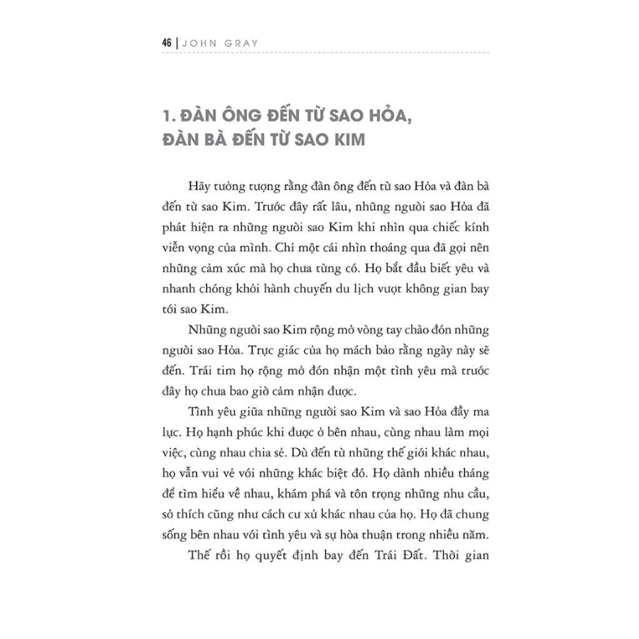 “Đàn ông sao Hỏa đàn bà sao Kim” là một trong 12 tác phẩm được bán chạy nhất của tác giả John Gray. Ngay từ khi ra mắt, tác phẩm nhanh chóng thu về đuoẹc hơn 15 triệu bản và trở thành cuốn sách " phí hư cấu được xếp hạng cao nhất những năm 1990. Cuốn sách này ra đời nhằm hướng đến những độc giả trong mối quan hệ tình cảm hay đã kết hôn đang đương đầu với những gánh nặng của trái tim, những bất đồng quan điểm của hai giới trong hôn nhân chỉ vì không hiểu nhau , từ đó giúp bạn đọc có thể hiểu chính bản thân mình và người khác giới, các bạn sẽ có một cái nhìn sâu sắc hơn, thấu hiểu hơn về nửa kia của mình.