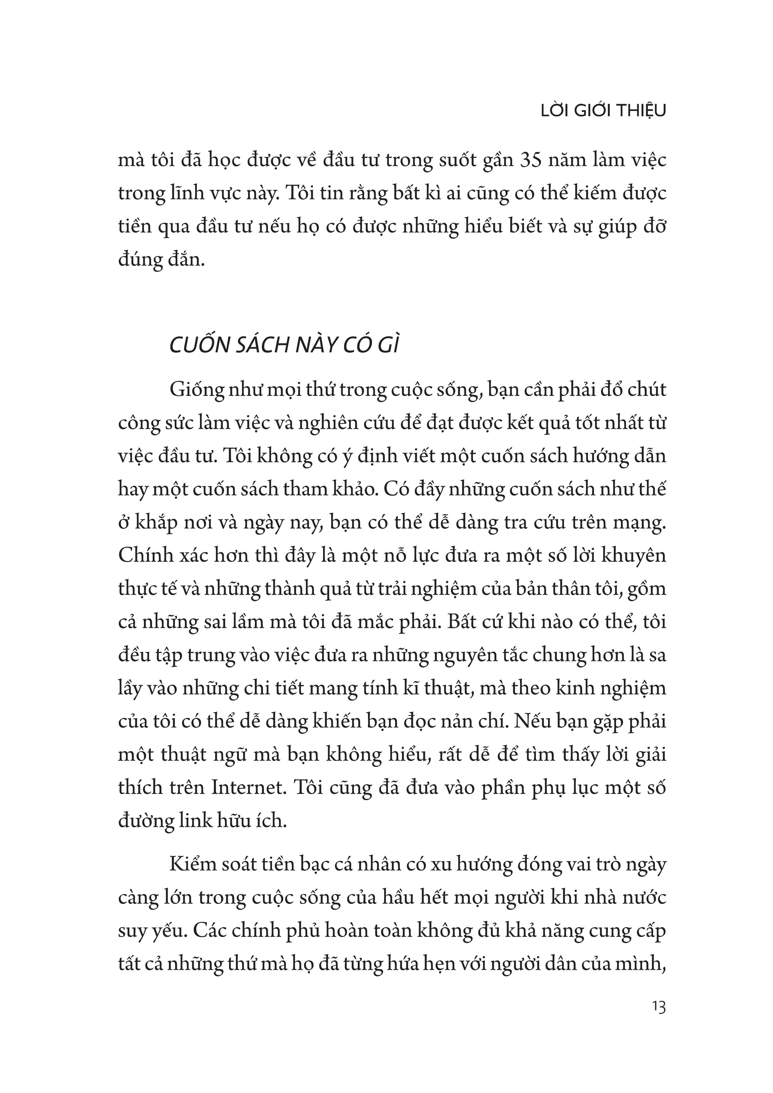 Giống như mọi thứ trong cuộc sống, bạn cần phải đổ chút công sức làm việc và nghiên cứu để đạt được kết quả tốt nhất từ việc đầu tư. Đây không phải là một cuốn sách hướng dẫn hay một cuốn sách tham khảo. Có đầy những cuốn sách như thế ở khắp nơi và ngày nay, bạn có thể dễ dàng tra cứu trên mạng. Chính xác hơn thì đây là một nỗ lực đưa ra một số lời khuyên thực tế và những thành quả từ trải nghiệm của bản thân tác giả, gồm cả những sai lầm đã mắc phải trong 10 chương sách:
