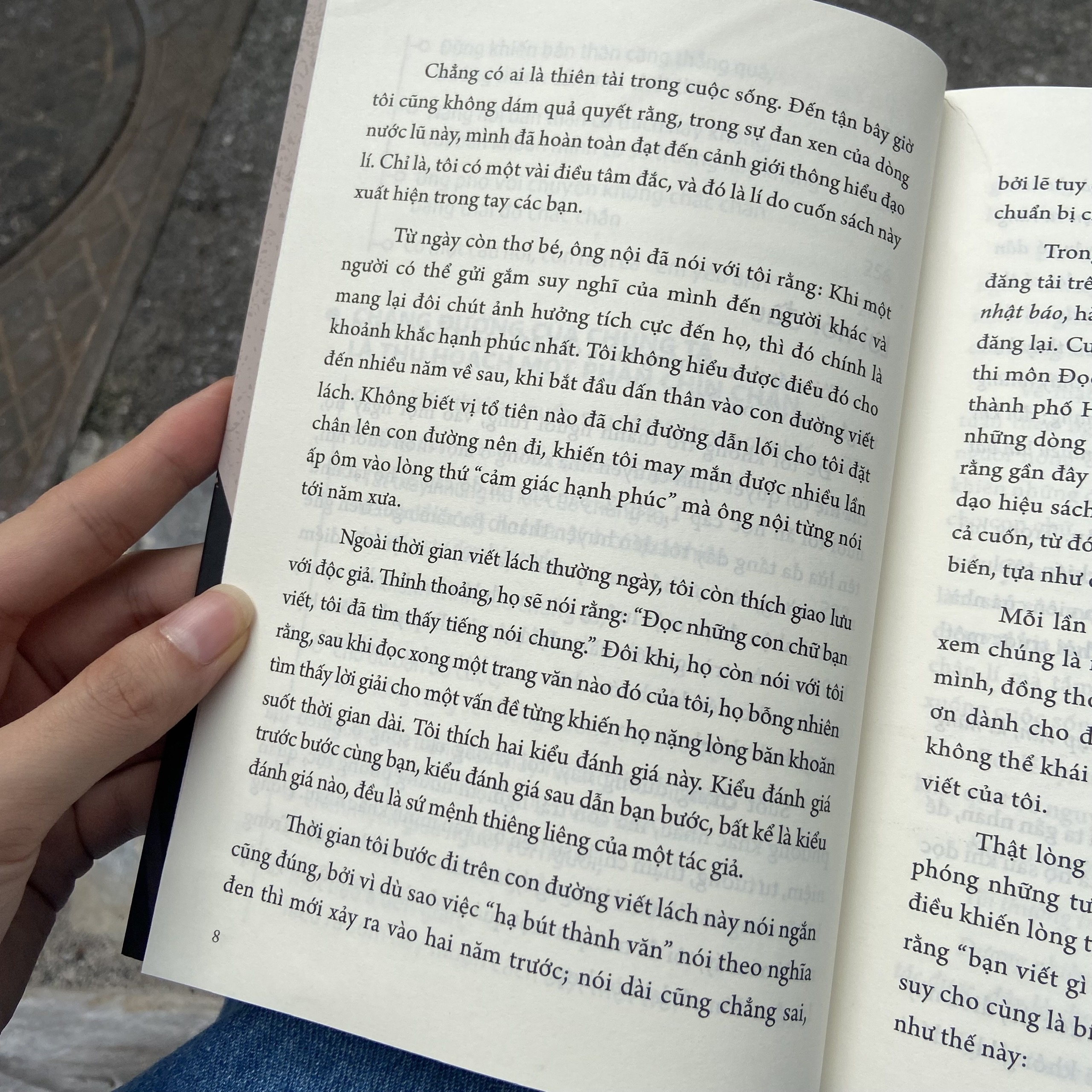 Và khi bạn lật giở từng bài viết trong cuốn sách này, bạn sẽ phát hiện ra một quy luật: đúng vậy, mỗi đoạn văn, mỗi chương chính là từng câu chuyện mà tác giả đã trải qua, những chuyện người viết đọc được, nhìn được, nghe thấy, trải qua. Nhưng chỉ cần bạn đọc một mạch hết bài viết, có lẽ vào một đêm tối sâu thẳm nào đó, sau khi khép lại trang sách, nhắm nghiền đôi mắt, bạn sẽ phát hiện ra rằng, suy cho cùng, những chuyện này đều là chuyện của bạn.