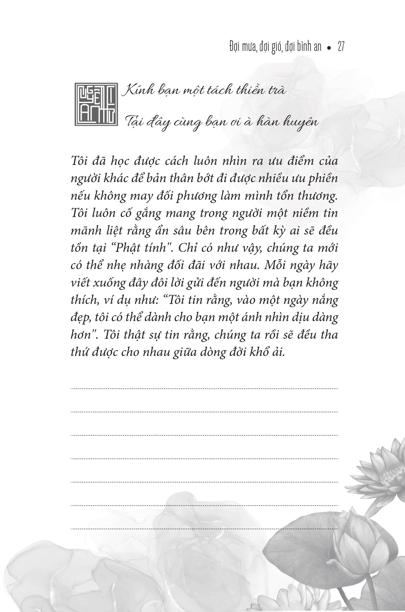 Đây cũng chính là những chia sẻ thấm thía của tác giả Huệ Như Hạm Đạm trong cuốn sách đầu tay “Đợi mưa, đợi gió, đợi bình an”.