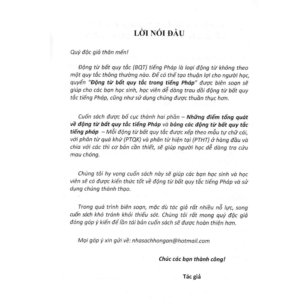 Chúng tôi hy vọng cuốn sách này sẽ giúp các bạn học sinh và học viên sẽ có được kiến thức tốt về động từ bất quy tắc tiếng Pháp và sử dụng chúng thành thạo.