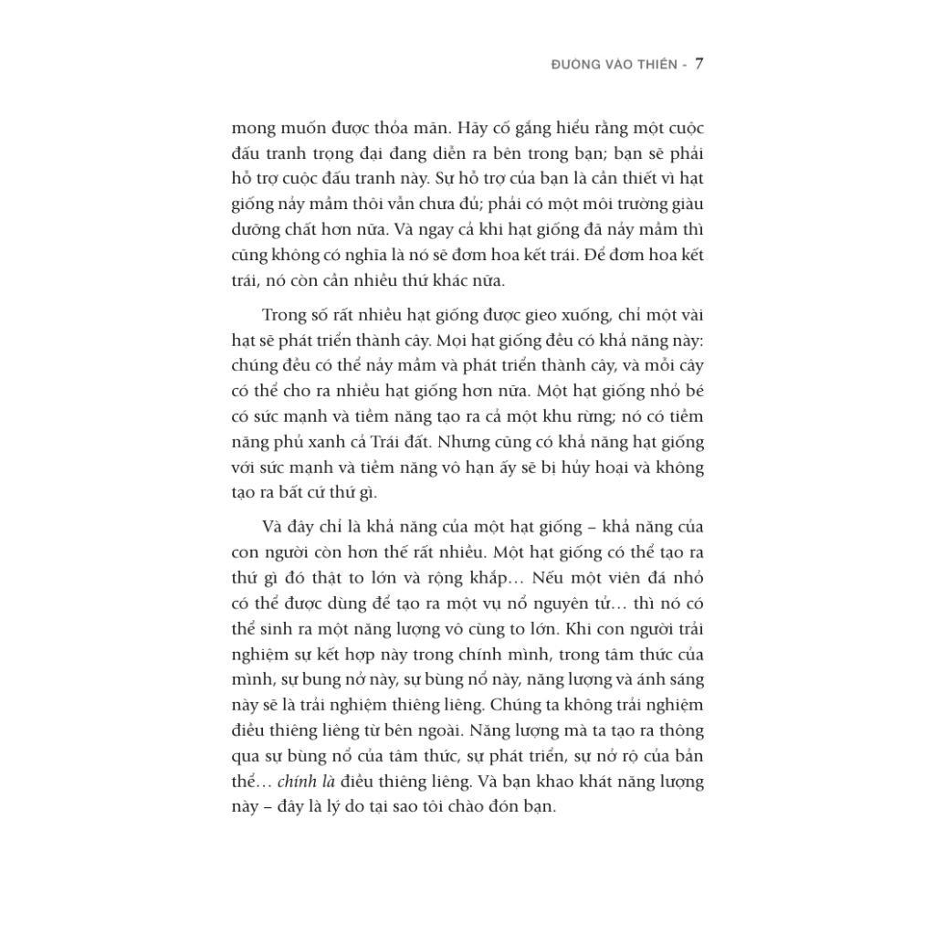 “Đường vào Thiền” (The path of meditation) tập hợp những bài giảng của Osho trong một khóa thiền do ông hướng dẫn, diễn ra trong ba ngày tại khu đồi Mahabaleshwar. Lật giở từng trang sách, chúng ta có cảm giác như đang có mặt tại thiền đường ở vùng núi non xinh đẹp ấy, và Osho ngồi trước mặt, đang hướng dẫn ta từng bước đi vào thiền.