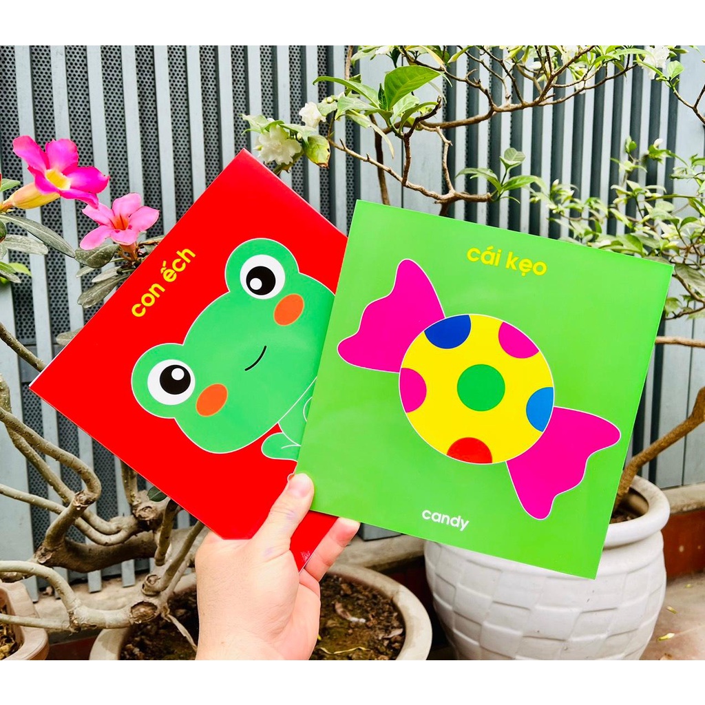 - Màu sắc (6 tháng tuổi trở lên) : 10 tranh Nội dung được lựa chọn là các con vật, rau củ, quả, cây, hoa, phương tiện giao thông, đồ vật … gần gũi và yêu thích với các bé. Các từ minh họa song ngữ Anh Việt ngắn gọn, dễ phát âm và dễ gọi tên, giúp cho cha mẹ có thể giáo dục sớm cho các bé tập nói, tập đọc, phát triển ngôn ngữ và giao tiếp. Các tranh sử dụng màu sắc có độ tương phản cao, hình ảnh rõ nét, thu hút sự tập trung của bé và đồng thời kích thích thị giác cho bé. Tranh được in bằng chất liệu giấy bìa cứng dày dặn, có thể xếp đứng xung quanh cho bé nằm xem và chơi. Đặc biệt, các tranh đều được phủ màng bóng chống thấm nước, dễ dàng lau chùi bụi bẩn, sử dụng bền lâu, tiết kiệm chi phí. Tranh có kích thước 20x20 cm. 1 bộ gồm có 4 tờ gấp, 1 tờ gấp gồm có 5 tranh in 2 mặt. Tổng cả bộ 4 tờ là 40 tranh. Tác giả: Thanh Hương Nhà xuất bản Thanh Niên Năm xuất bản: 2022 Số trang: 10 Công ty phát hành Việt Hà