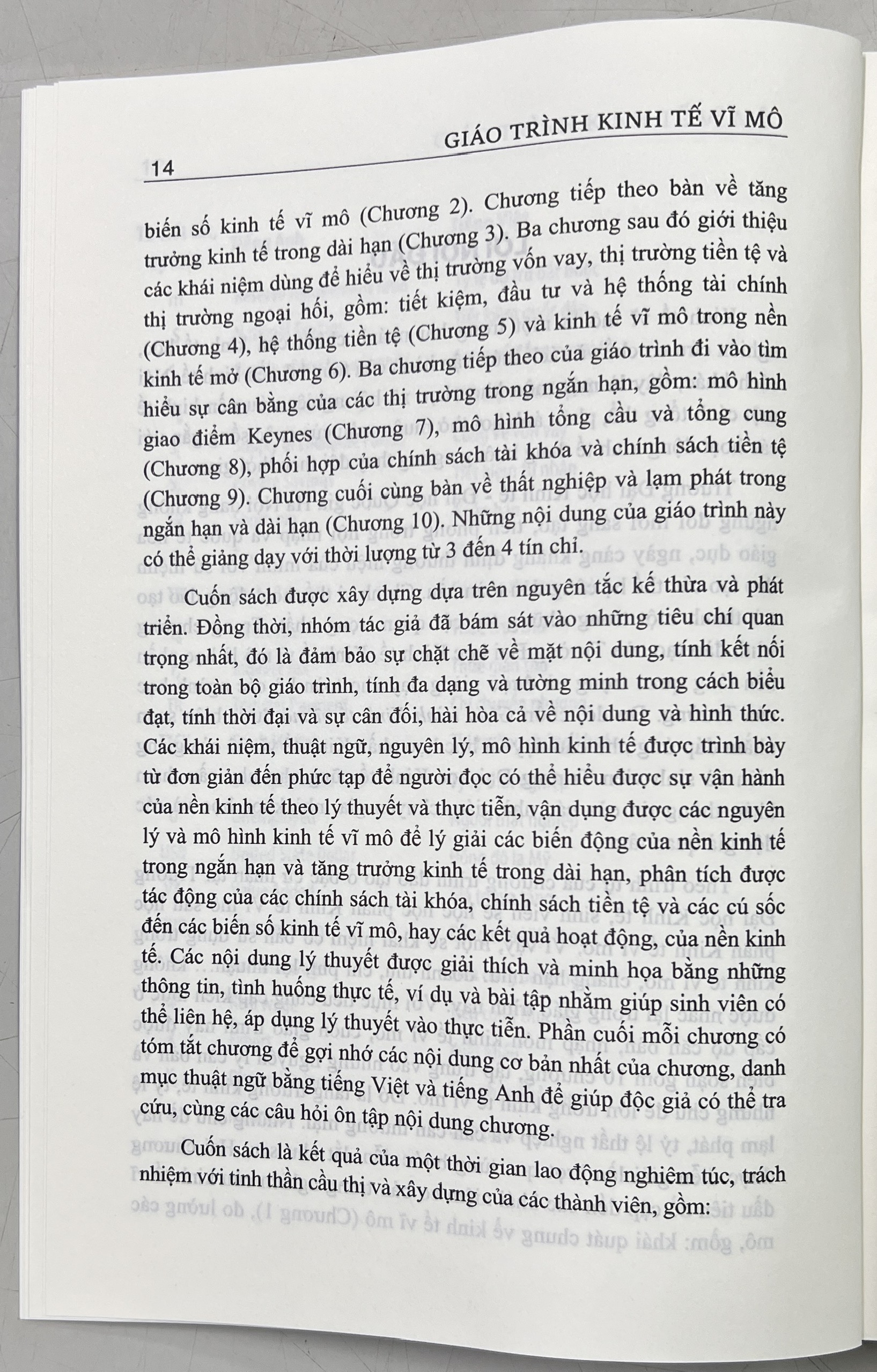 Theo trình tự của chương trình đào tạo ở bậc cử nhân tại Trường Đại học Kinh tế, sinh viên sẽ học học phần Kinh tế Vĩ mô sau học phần Kinh tế Vi mô. Vì vậy, một số khái niệm cơ bản sử dụng trong kinh tế vĩ mô, chẳng hạn doanh thu, chi phí, lợi nhuận… không được nhắc lại trong giáo trình này. Với mục tiêu cung cấp kiến thức ở cấp độ căn bản, nhập môn kinh tế vĩ mô, cuốn giáo trình này được biên soạn gồm 10 chương, tập trung vào những nguyên lý căn bản và những chủ đề lớn trong kinh tế vĩ mô. Đó là tăng trưởng kinh tế, tỷ lệ lạm phát, tỷ lệ thất nghiệp và cán cân thương mại. Những chủ đề này được diễn giải lần lượt qua từng bước dẫn dắt như sau: Hai chương đầu tiên đề cập đến các khái niệm cơ bản trong nghiên cứu kinh tế vĩ mô, gồm: Khái quát chung về kinh tế vĩ mô (Chương 1) và các biến số kinh tế vĩ mô (Chương 2). Chương tiếp theo bàn về tăng trưởng kinh tế trong dài hạn (Chương 3). Ba chương sau đó giới thiệu các khái niệm dùng để hiểu về thị trường vốn vay, thị trường tiền tệ và thị trường ngoại hối, gồm tiết kiệm, đầu tư và hệ thống tài chính (Chương 4), hệ thống tiền tệ (Chương 5) và kinh tế vĩ mô của nền kinh tế mở (Chương 6). Ba chương tiếp theo của giáo trình đi vào tìm hiểu sự cân bằng của các thị trường trong ngắn hạn, gồm: Mô hình giao điểm Keynes (Chương 7), Mô hình tổng cầu và tổng cung (Chương , tác động của chính sách tài khóa và chính sách tiền tệ (Chương 9). Chương cuối cùng bàn về thất nghiệp và lạm phát trong ngắn hạn và dài hạn (Chương 10). Những nội dung của giáo trình này có thể giảng dạy với thời lượng từ 3 đến 4 tín chỉ.