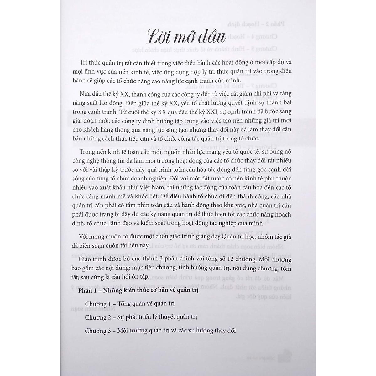 Giáo trình được bố cục thành 3 phần chính với tổng số 12 chương. Mỗi chương bao gồm các nội dung : mục tiêu chương, tình huống quản trị, nội dung chương, tóm tắt, sau cùng là câu hỏi ôn tập