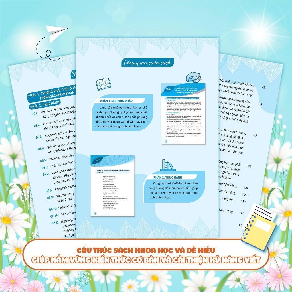 - Phương pháp viết đoạn và bài văn theo các dạng bài trong SGK: đưa ra những hướng dẫn tỉ mỉ, cụ thể cách viết đoạn văn ghi lại cảm xúc về một bài thơ 8 chữ và viết bài văn theo từng thể loại cụ thể (nghị luận xã hội, nghị luận văn học, thuyết minh, kịch).