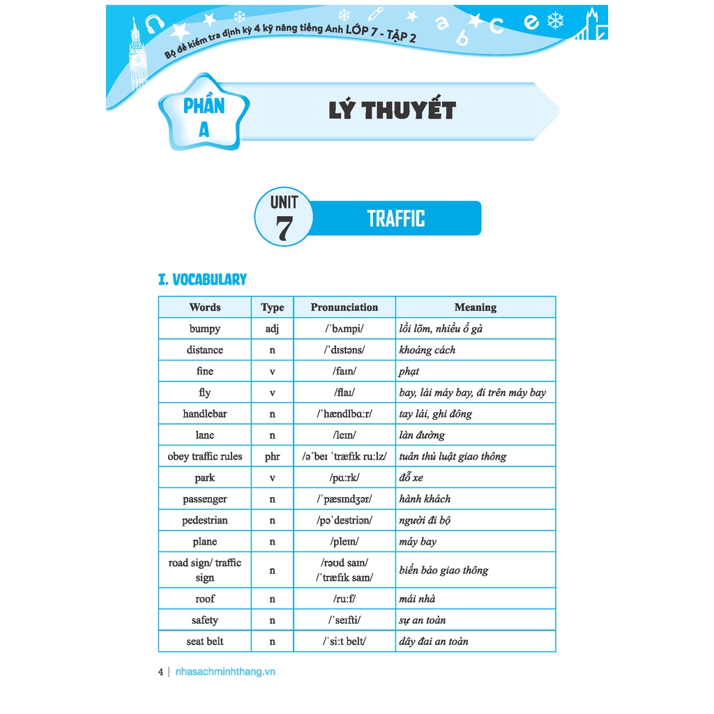 Trên hành trình tìm kiếm tri thức, các em thường xuyên phải đối mặt với các bài kiểm tra định kì, khiến các em cảm thấy căng thẳng, lo lắng và đôi khi kết quả không như mong đợi. Điều này không hẳn do các em chưa thật sự chăm chỉ hay không hiểu bài dẫn đến kết quả không đạt được như kỳ vọng, đôi khi còn phụ thuộc vào nhiều yếu tố như kĩ năng làm bài, kĩ năng quản lý thời gian hay chưa nắm được kết cấu đề Thấu hiểu được những khó khăn và những tình huống các em thường gặp phải, nhóm tác giả đã dành nhiều thời gian biên soạn “Bộ đề kiểm tra định kỳ 4 kỹ năng nghe - nói - đọc - viết Tiếng Anh lớp 7” nhằm rên luyện cho các em kĩ năng làm bài thi, làm chủ các dạng đề, hiểu được kết cấu và cách thức ra đề của từng kỳ thi. Khi các em đã quen với các dạng bài tập và trải nghiệm làm đề thường xuyên thì việc tự tin trước các kỳ thi là điều hiển nhiên có được.