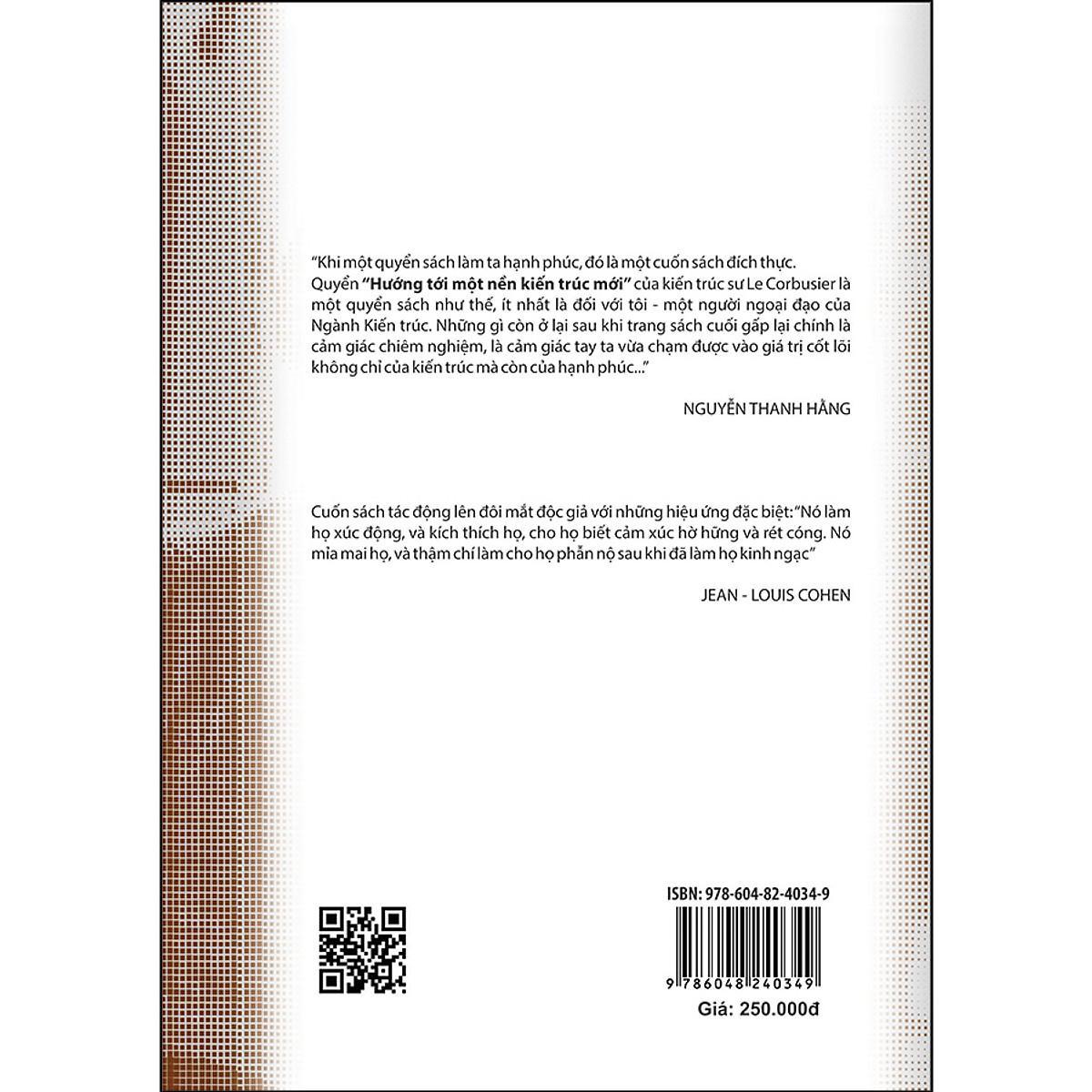 Mua tại TiktokHướng tới một nền kiến trúc mới, là một trong những tác phẩm quan trọng, có ảnh hưởng nhất ở thời điểm mà nó xuất bản (1923). Cuốn sách được xem là lý luận nền tảng về kiến trúc của thế kỉ XX và cho đến thời điểm hiện tại, là sự cần thiết không chỉ dành cho các kiến trúc sư hành nghề mà còn cho cả những ai quan tâm đến ngôi nhà của chính mình, đến chất lượng sống trong một xã hội hiện đại.