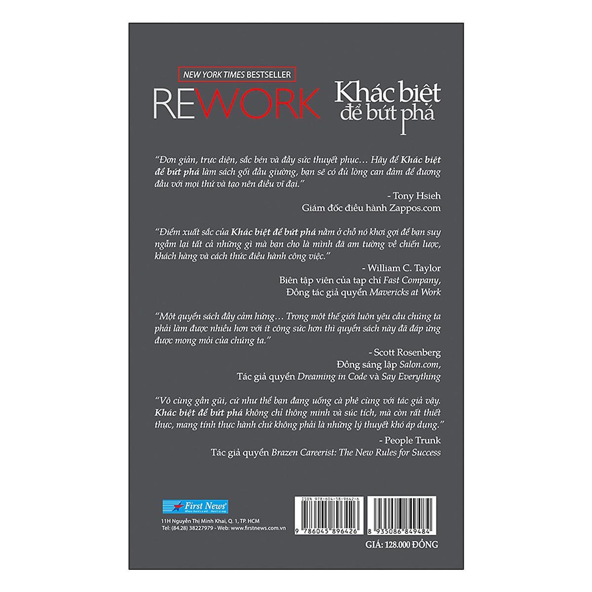 Hầu hết các sách kinh doanh đều cho bạn cùng một lời khuyên. Đó là viết ra bản kế hoạch, nghiên cứu thị trường, tìm kiếm nhà đầu tư, vân vân và vân vân. Nếu bạn đang tìm một quyển sách như thế, tôi khuyên bạn hãy đặt cuốn sách này trở lại kệ. Khác biệt để bứt phá chỉ cho bạn một phương thức vô cùng dễ dàng để bạn gặt hái thành công. Bạn sẽ biết vì sao mình không cần đến nguồn vốn bên ngoài và vì sao bạn nên phớt lờ sự cạnh tranh. Sự thật là bạn cần ít hơn bạn nghĩ. Bạn không cần phải làm việc cật lực, không cần phải hoang phí thời gian cho công việc giấy tờ hay họp hội. Bạn thậm chí còn không cần đến cả văn phòng nữa. Những thứ đó tất thảy đều dư thừa. Cái bạn cần là đừng nói nữa, mà hãy bắt tay vào việc. Cuốn sách sẽ chỉ cho bạn khối điều hay ho. Bạn sẽ học cách làm việc hiệu quả hơn mà không mất quá nhiều thời gian. Thẳng thắng, rõ ràng và dễ đọc, Khác biệt để bứt phá là cuốn sách thực tiễn tuyệt vời dành cho những ai đã và đang mơ ước đến việc tạo dựng một thứ gì đó bằng chính sức mình.