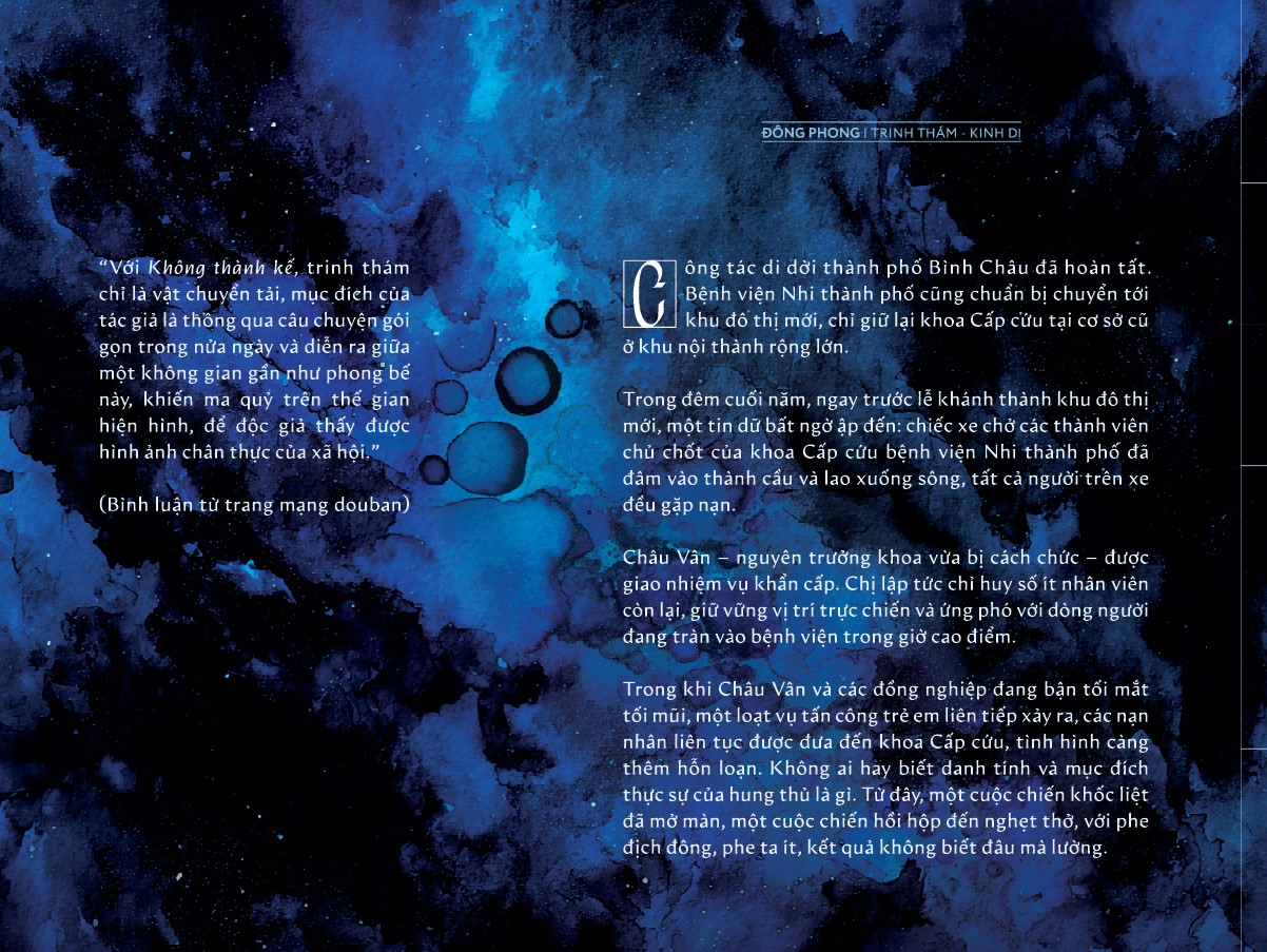 Nhà phát hành: Nhã Nam Nhà xuất bản: Hội Nhà Văn Tác giả: Hô Diên Vân Dịch giả: Nhượng Lê Số trang: 568 Kích thước: 15.5 x 24 cm Công tác di dời thành phố Bình Châu đã hoàn tất. - Bệnh viện Nhi thành phố cũng chuẩn bị chuyển tới khu đô thị mới, chỉ giữ lại khoa Cấp cứu tại cơ sở cũ ở khu nội thành rộng lớn. Trong đêm cuối năm, ngay trước lễ khánh thành khu đô thị mới, một tin dữ bất ngờ ập đến: chiếc xe chở các thành viên chủ chốt của khoa Cấp cứu bệnh viện Nhi thành phố đã đâm vào thành cầu và lao xuống sông, tất cả người trên xe đều gặp nạn. Châu Vân – nguyên trưởng khoa vừa bị cách chức – được giao nhiệm vụ khẩn cấp. Chị lập tức chỉ huy số ít nhân viên còn lại, giữ vững vị trí trực chiến và ứng phó với dòng người đang tràn vào bệnh viện trong giờ cao điểm. Trong khi Châu Vân và các đồng nghiệp đang bận tối mắt tối mũi, một loạt vụ tấn công trẻ em liên tiếp xảy ra, các nạn nhân liên tục được đưa đến khoa Cấp cứu, tình hình càng thêm hỗn loạn. Không ai hay biết danh tính và mục đích thực sự của hung thủ là gì. Từ đây, một cuộc chiến khốc liệt đã mở màn, một cuộc chiến hồi hộp đến nghẹt thở, với phe địch đông, phe ta ít, kết quả không biết đâu mà lường.