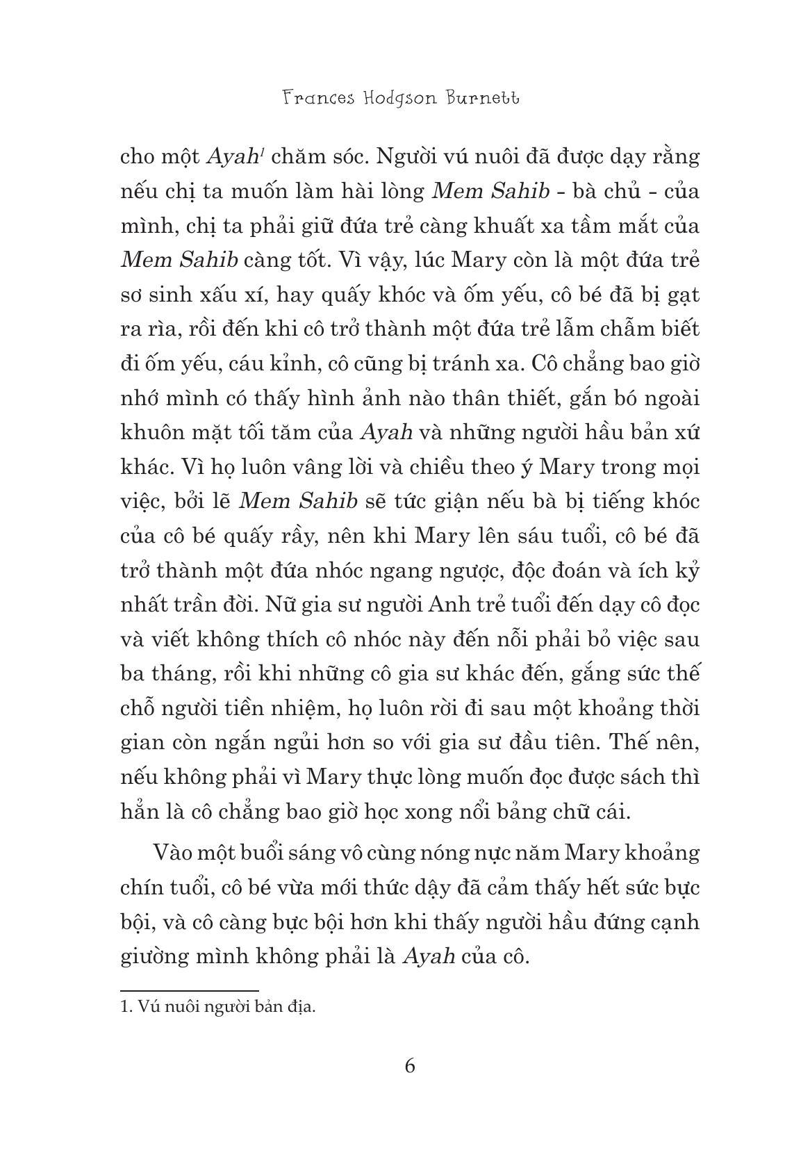 Khi Mary Lennox được gửi đến trang viên Misselthwaite để sống với chú của cô bé, mọi người đều bảo rằng cô là đứa trẻ khó ưa nhất mà họ từng thấy. Nói vậy kể ra cũng có lý. Cô có khuôn mặt thon nhỏ, thân hình mảnh khảnh, mái tóc mỏng sáng màu và vẻ mặt cau có. Tóc cô màu vàng và khuôn mặt cũng vàng vọt vì cô sinh ra ở Ấn Độ, cứ nay ốm mai đau