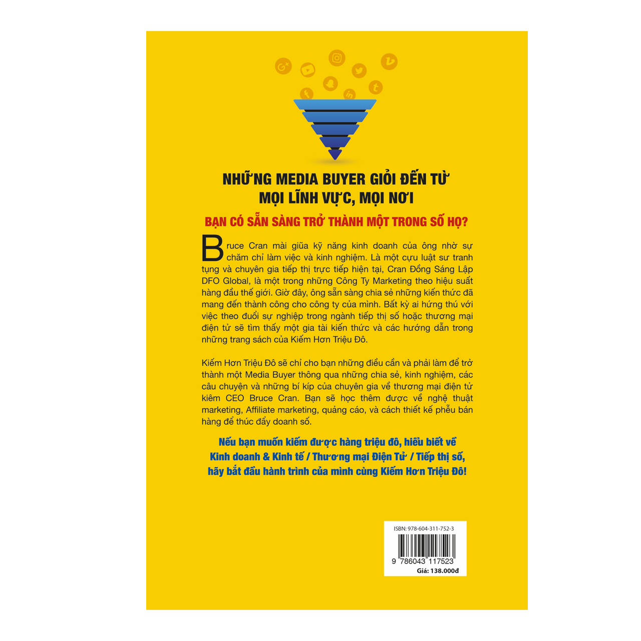“Kiếm Hơn Triệu Đô” diễn giải chi tiết cách để trở thành một Media Buyer giỏi. Là một chuyên gia thương mại điện tử kiêm CEO Bruce P. Cran sẵn sàng chia sẻ những câu chuyện, những kinh nghiệm, các bí quyết quảng cáo hiệu quả, cách để tạo được nội dung quảng cáo hay, nghệ thuật bán hàng và cách thiết kế phễu bán hàng thúc đẩy doanh số.
