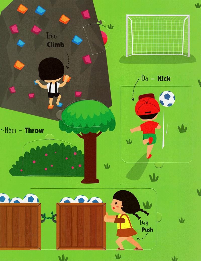 Bố mẹ và bé hãy mở cuốn sách này ra rồi lật những miếng ghép lên để cùng học rất nhiều từ song ngữ Việt – Anh về cơ thể người nhé!