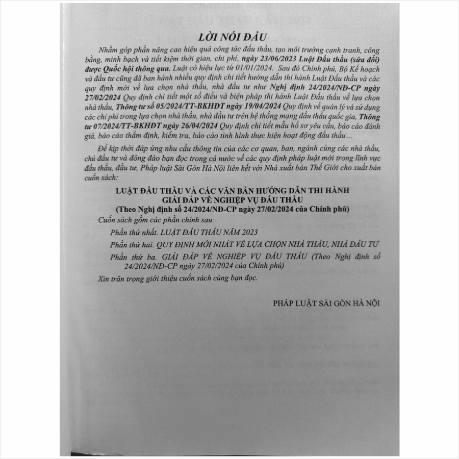 - Toàn bộ sách bìa mềm khổ lớn 20 x 28 cm phân phối bởi Nhà sách Nam Việt đều được bọc sách Plastic MIỄN PHÍ và xuất hóa đơn điện tử đầy đủ, nhanh chóng. …//… Lời giới thiệu: Nhằm góp phần nâng cao hiệu quả công tác đấu thầu, tạo môi trường cạnh tranh, công bằng, minh bạch và tiết kiệm thời gian, chi phí, ngày 23/06/2023 Luật Đấu thầu số 22/2023/QH15 được Quốc hội thông qua. Luật có hiệu lực thi hành từ ngày 01/01/2024, Sau đó Bộ Kế hoạch và đầu tư cũng đã ban hành nhiều quy định chi tiết hướng dẫn thi hành Luật Đấu thầu và các quy định mới về lựa chọn nhà thầu, nhà đầu tư như Nghị định số 24/2024/NĐ-CP ngày 27/02/2024 Quy định chi tiết một số điều và biện pháp thi hành Luật Đấu thầu về lựa chọn nhà thầu, Thông tư số 05/2024/TT-BKHĐT ngày 19/04/2024 Quy định về quản lý và sử dụng các chi phí trong lựa chọn nhà thầu, nhà đầu tư trên hệ thống mạng đấu thầu quốc gia, Thông tư số 07/2024/TT-BKHĐT ngày 26/04/2024 Quy định chi tiết mẫu hồ sơ yêu cầu, báo cáo đánh giả, báo cáo thẩm định, kiểm tra, báo cáo tình hình thực hiện hoạt động đấu thầu … Nhằm phổ biến đến Quý Cơ quan, Đơn vị và Quý khách hàng thân thiết nắm bắt kịp thời những quy định mới nêu trên. Nhà sách Nam Việt xin trân trọng giới thiệu cuốn sách: LUẬT ĐẤU THẦU VÀ CÁC VĂN BẢN HƯỚNG DẪN THI HÀNH GIẢI ĐÁP VỀ NGHIỆP VỤ ĐẤU THẦU (Theo Nghị định số 24/2024/NĐ-CP ngày 27/02/2024 của Chính phủ) …//… Cuốn sách gồm các phần chính sau: Phần thứ nhất. LUẬT ĐẤU THẦU NĂM 2023 (có hiệu lực thi hành từ ngày 01/01/2024) Phần thứ hai. QUY ĐỊNH MỚI NHẤT VỀ LỰA CHỌN NHÀ THẦU, NHÀ ĐẦU TƯ Phần thứ ba. GIẢI ĐÁP VỀ NGHIỆP VỤ ĐẤU THẦU (Theo Nghị định số 24/2024/NĐ-CP ngày (27/02/2024 của Chính phủ) ...//... Cảm ơn các bạn đã ghé thăm shop Nhà sách Nam Việt ! Sách Luật Đấu Thầu và Các Văn Bản Hướng Dẫn Thi Hành - Giải Đáp Về Nghiệp Vụ Đấu Thầu theo Nghị Định số 24/2024/NĐ-CP Sách Luật Đấu Thầu và Các Văn Bản Hướng Dẫn Thi Hành - Giải Đáp Về Nghiệp Vụ Đấu Thầu theo Nghị Định số 24/2024/NĐ-CP