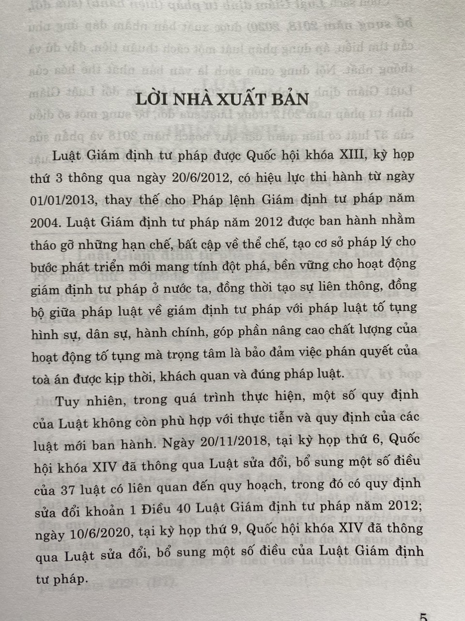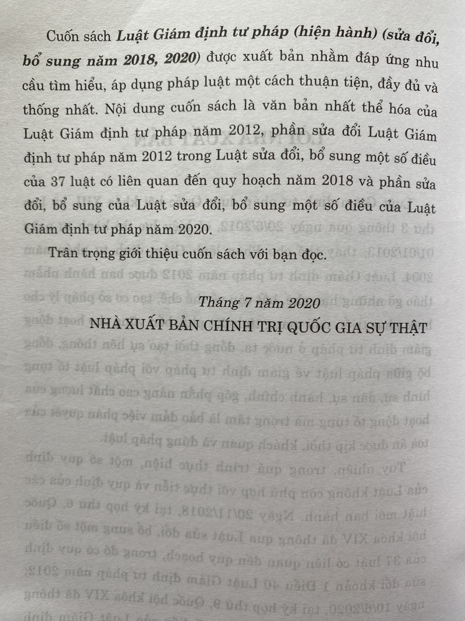 Luật Giám định tư pháp (hiện hành) (sửa đổi, bổ sung năm 2018, 2020) gồm 7 chương, 46 điều, quy định về: giám định viên tư pháp; tổ chức giám định tư pháp; người giám định tư pháp theo vụ việc, tổ chức giám định tư pháp theo vụ việc; hoạt động giám định tư pháp; chi phí giám định tư pháp, chế độ, chính sách trong hoạt động giám định tư pháp và trách nhiệm của cơ quan nhà nước đối với tổ chức, hoạt động giám định tư pháp. Luật Giám định tư pháp được Quốc hội khóa XIII, kỳ họp thứ 3 thông qua ngày 20/6/2012 và được sửa đổi, bổ sung vào các năm 2018, 2020. Cuốn sách Luật Giám định tư pháp (hiện hành) (sửa đổi, bổ sung năm 2018, 2020) là văn bản luật hợp nhất của Luật Giám định tư pháp năm 2012 và các nội dung của hai lần sửa đổi tạo thành một văn bản Luật Giám định tư pháp thống nhất hiện hành và mới nhất thuận tiện trong sử dụng tra cứu tham khảo.