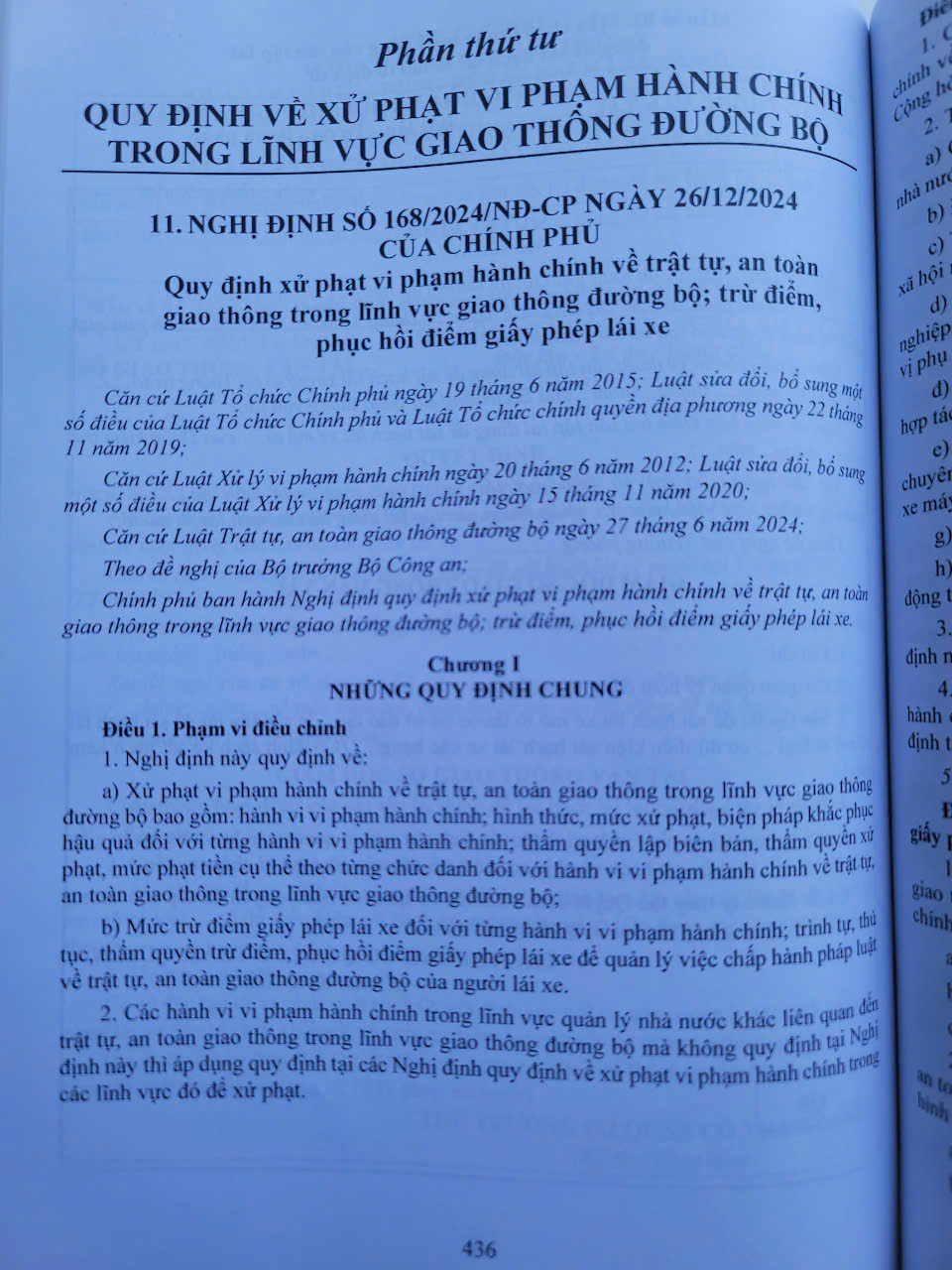 - Toàn bộ sách bìa mềm khổ lớn 20 x 28 cm phân phối bởi Nhà sách Nam Việt đều được bọc sách Plastic MIỄN PHÍ và xuất hóa đơn điện tử đầy đủ, nhanh chóng. ...//… Lời giới thiệu: Luật Trật tự, an toàn giao thông đường bộ số 36/2024/QH15 được Quốc hội thông qua ngày 27/6/2024, có hiệu lực thi hành từ ngày 01/01/2025 với nhiều điểm mới như: thay đổi phân hạng giấy phép lái xe; tăng độ tuổi tối đa của người lái xe; bổ sung quy định trừ điểm giấy phép lái xe; từ 01/01/2026, không được cho trẻ em dưới 10 tuổi và chiều cao dưới 1,35m ngồi cùng hàng ghế tài xế... Để triển khai Luật kịp thời, thống nhất, hiệu lực, hiệu quả, Chính phủ và các Bộ ngành cũng đã ban hành nhiều văn bản hướng dẫn Luật như Nghị định số 151/2024/NĐ-CP ngày 15/11/2024 Quy định chi tiết một số điều và biện pháp thi hành Luật Trật tự, an toàn giao thông đường bộ; Thông tư số 73/2024/TT-BCA ngày 15/11/2024 Quy định công tác tuần tra, kiểm soát, xử lý vi phạm pháp luật về trật tự, an toàn giao thông đường bộ của cảnh sát giao thông; Nghị định số 168/2024/NĐ-CP ngày 26/12/2024 Quy định xử phạt vi phạm hành chính về trật tự, an toàn giao thông trong lĩnh vực giao thông đường bộ; trừ điểm, phục hồi điểm giấy phép lái xe... Nhằm góp phần phổ biến những quy định pháp luật về giao thông đường bộ cho các cơ quan ban ngành, cá nhân trong và ngoài nước, Nhà sách Nam Việt xin trân trọng giới thiệu cuốn sách: Luật Trật Tự, An Toàn Giao Thông Đường Bộ Và Văn Bản Hướng Dẫn Quy Trình Tuần Tra, Xử Lý Vi Phạm Về Trật Tự, An Toàn Giao Thông Đường Bộ, Đào Tạo, Sát Hạch, Cấp Giấy Phép Lái Xe …//… Nội dung cuốn sách gồm 4 phần sau: Phần thứ nhất. Luật trật tự, an toàn giao thông đường bộ và nghị định hướng dẫn thi hành Phần thứ hai. Quy định công tác tuần tra, kiểm soát, xử lý vi phạm pháp luật về trật tự, an toàn giao thông đường bộ Phần thứ ba. Quy định về đào tạo, sát hạch, cấp giấy phép lái xe Phần thứ tư. Quy định về xử phạt vi phạm hành chính trong lĩnh vực giao thông đường bộ *** Quý khách hàng hãy an tâm khi mua sách tại Nhà sách Nam Việt, cam kết uy tín, chất lượng, sách bản gốc chuẩn đẹp, được kiểm hàng, hài lòng mới thanh toán, sách đã được bọc plastic cao cấp miễn phí! …//… Cảm ơn các bạn đã ghé thăm shop Nhà sách Nam Việt ! Sách Luật Trật Tự, An Toàn Giao Thông Đường Bộ Và Văn Bản Hướng Dẫn Quy Trình Tuần Tra, Xử Lý Vi Phạm Về Trật Tự, An Toàn Giao Thông Đường Bộ, Đào Tạo, Sát Hạch, Cấp Giấy Phép Lái Xe Sách Luật Trật Tự, An Toàn Giao Thông Đường Bộ Và Văn Bản Hướng Dẫn Quy Trình Tuần Tra, Xử Lý Vi Phạm Về Trật Tự, An Toàn Giao Thông Đường Bộ, Đào Tạo, Sát Hạch, Cấp Giấy Phép Lái Xe