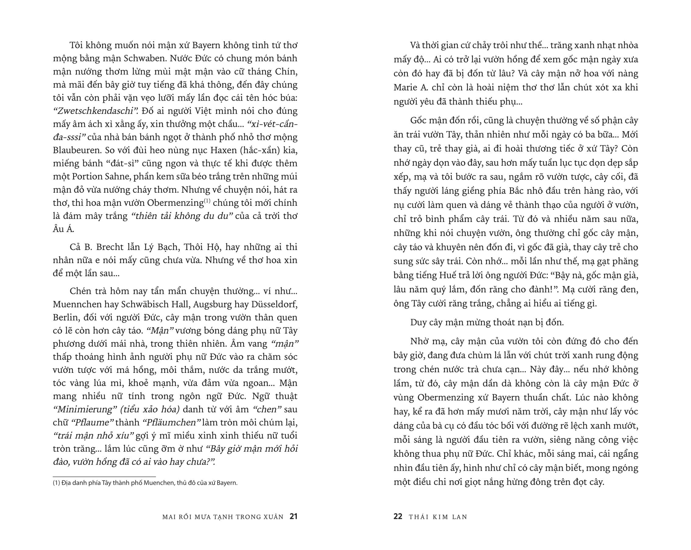 Lần bước theo cảm xúc trong tản văn Thái Kim Lan, người đọc sẽ cùng Tác giả vào Đường Sương, qua Đường Mưa để dần ngộ ra giữa chốn nhung nhớ ảo huyền ấy một MAI RỒI MƯA TẠNH TRONG XUÂN...