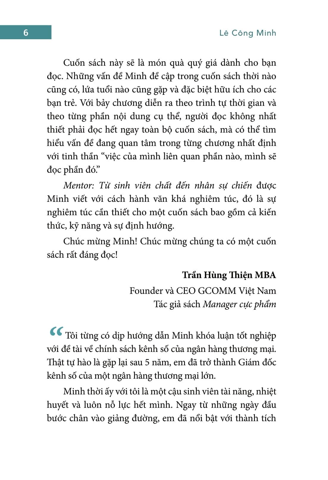 Quyển sách “MENTOR – Từ sinh viên chất đến nhân sự chiến” là “đứa con” đầy tâm huyết của tác giả Lê Công Minh - từ cậu thanh niên “fail toàn tập” khi thi trượt đại học, lẹt đẹt với bảng thành tích làng nhàng cho đến Giám đốc kênh Ngân hàng số, cựu nhân viên tại “Big 4 ngành kiểm toán thế giới” - Deloitte Digital và là nhà sáng lập của trung tâm tiếng Anh Mingology.