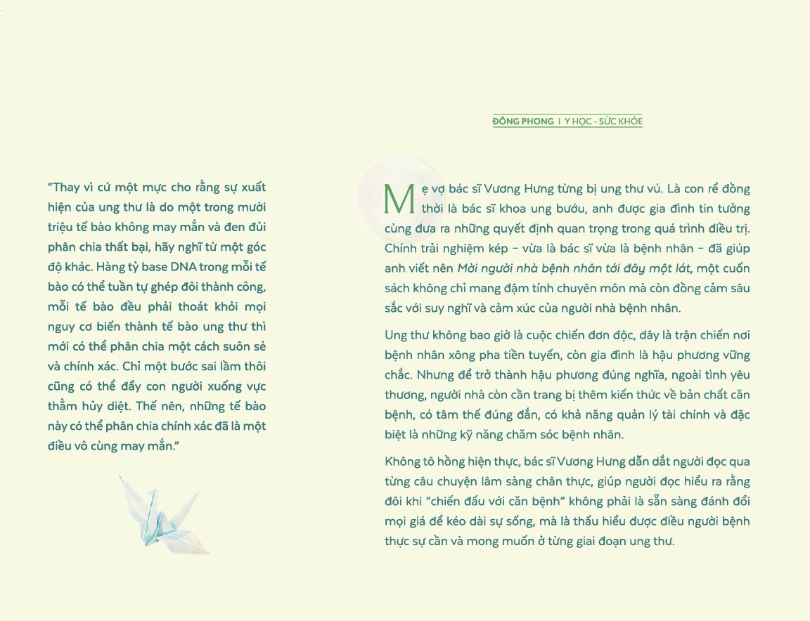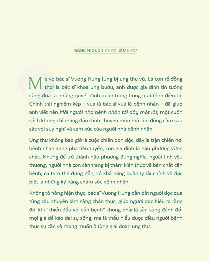 Không tô hồng hiện thực, bác sĩ Vương Hưng dẫn dắt người đọc qua từng câu chuyện lâm sàng chân thực, giúp người đọc hiểu ra rằng đôi khi “chiến đấu với căn bệnh" không phải là sẵn sàng đánh đổi mọi giá để kéo dài sự sống, mà là thấu hiểu được điều người bệnh thực sự cần và mong muốn ở từng giai đoạn ung thư.