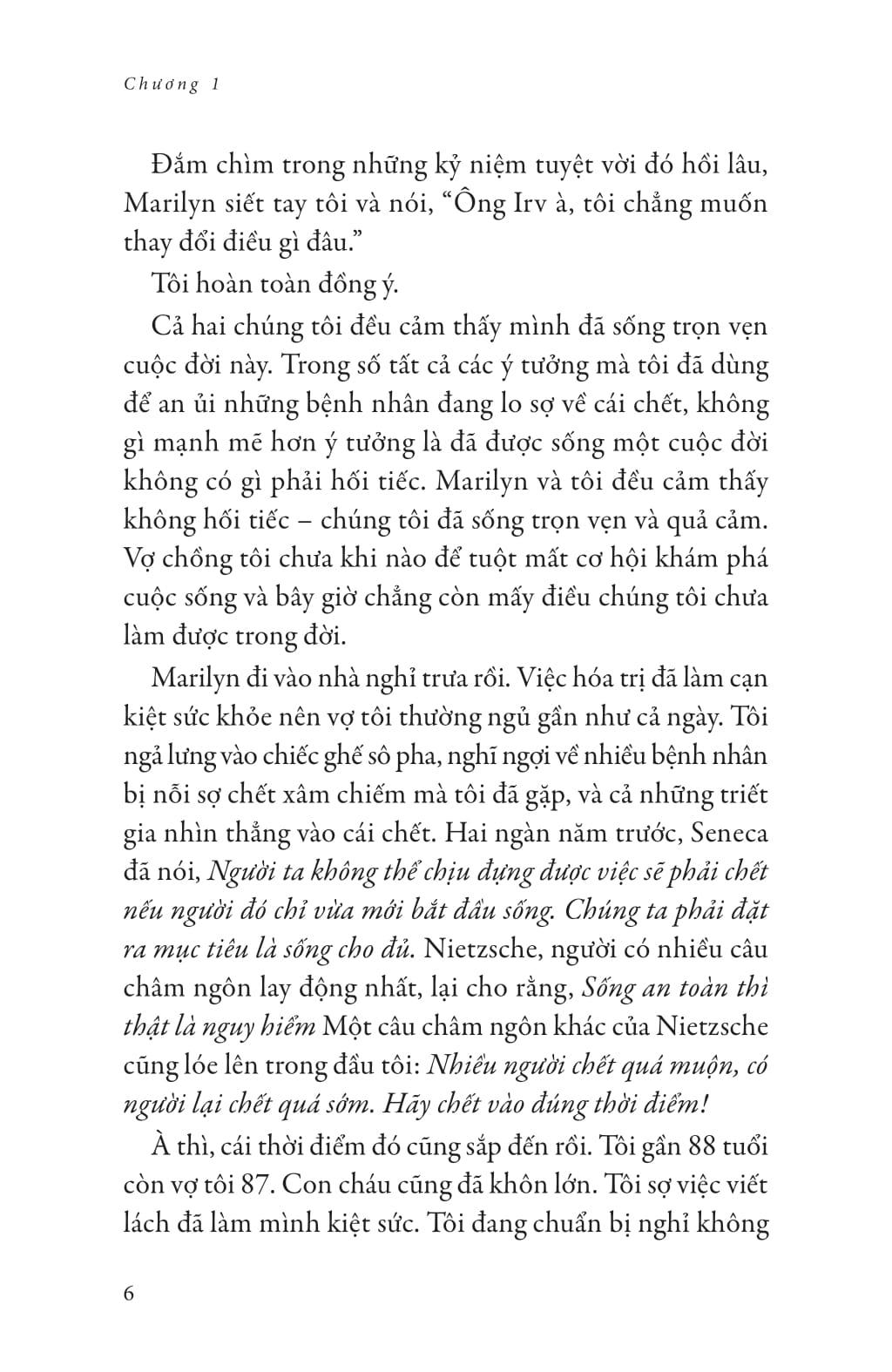 Bản thân ta còn có thể thức dậy hôm nay, nghĩa là ta đã sở hữu điều kiện cơ bản để được hạnh phúc. Nhưng giữa guồng quay cuộc sống bộn bề, ta chỉ mải chú tâm vào được và mất, mong cầu và phiền não, mà quên rằng sự sống vốn là món quà vô giá, lẽ ra phải được trân quý bằng cả trái tim. Hiếm lời khuyên nào có sức lay động mạnh mẽ hơn chính những câu từ bình thản và đầy trải nghiệm, viết từ chặng cuối đời người. Câu chuyện tình yêu bền bỉ tháng năm của vợ chồng Yalom sẽ tiếp thêm động lực để ta yêu thương và hy vọng vào cuộc sống, kể cả trong tháng ngày khó khăn vô định. Khi cầm quyển sách trên tay, là ta đã sẵn sàng cho sự chuyển hóa tích cực và cần thiết đối với bất kỳ ai.