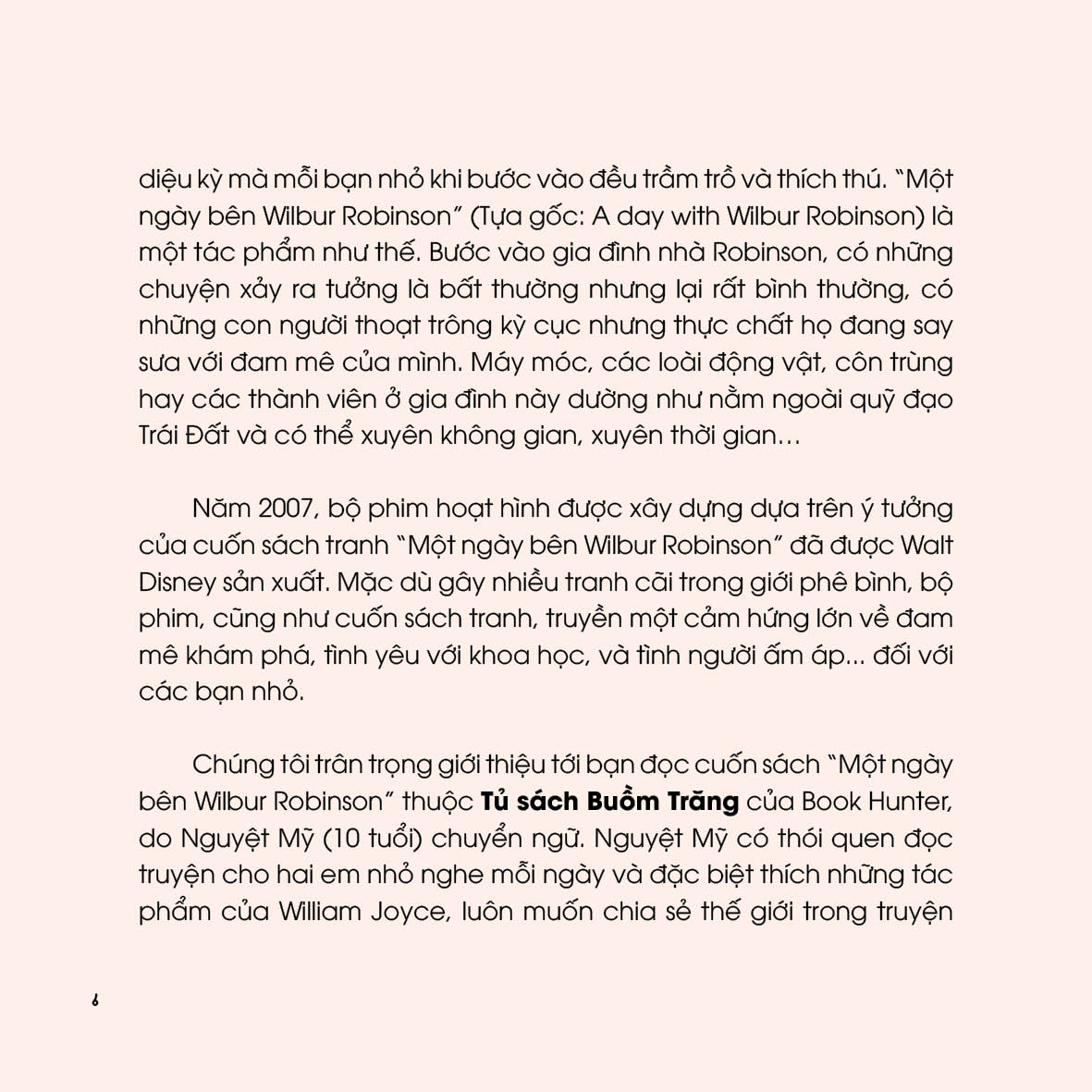 các bạn nhỏ. Chúng tôi trân trọng giới thiệu tới bạn đọc cuốn sách “Một ngày bên Wilbur Robinson” thuộc Tủ sách Buồm Trăng của Book Hunter, do Nguyệt Mỹ (10 tuổi) chuyển ngữ. Nguyệt Mỹ có thói quen đọc truyện cho hai em nhỏ nghe mỗi ngày và đặc biệt thích những tác phẩm của William Joyce, luôn muốn chia sẻ thế giới trong truyện thiếu nhi của William Joyce cho nhiều bạn đọc Việt Nam cùng biết.