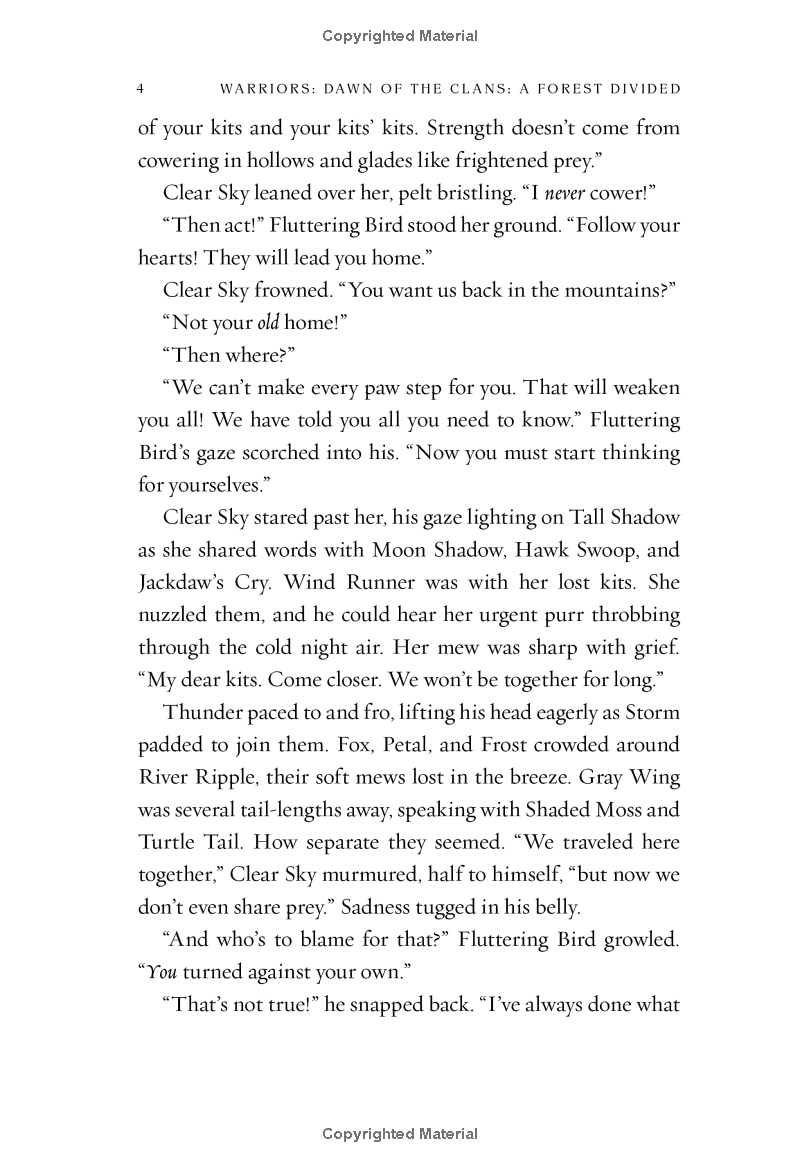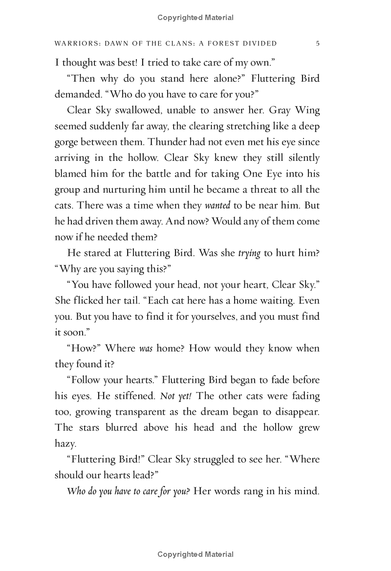 The spirit-cats have spoken: to survive, the cats from the mountains must grow and spread like the Blazing Star. Clear Sky believes the only way to grow is to band together again, but few cats are willing to ally with him. While Tall Shadow plans to establish a new camp in the pine forest, River Ripple is content by the water, and Wind Runner has made her own home on the moor.