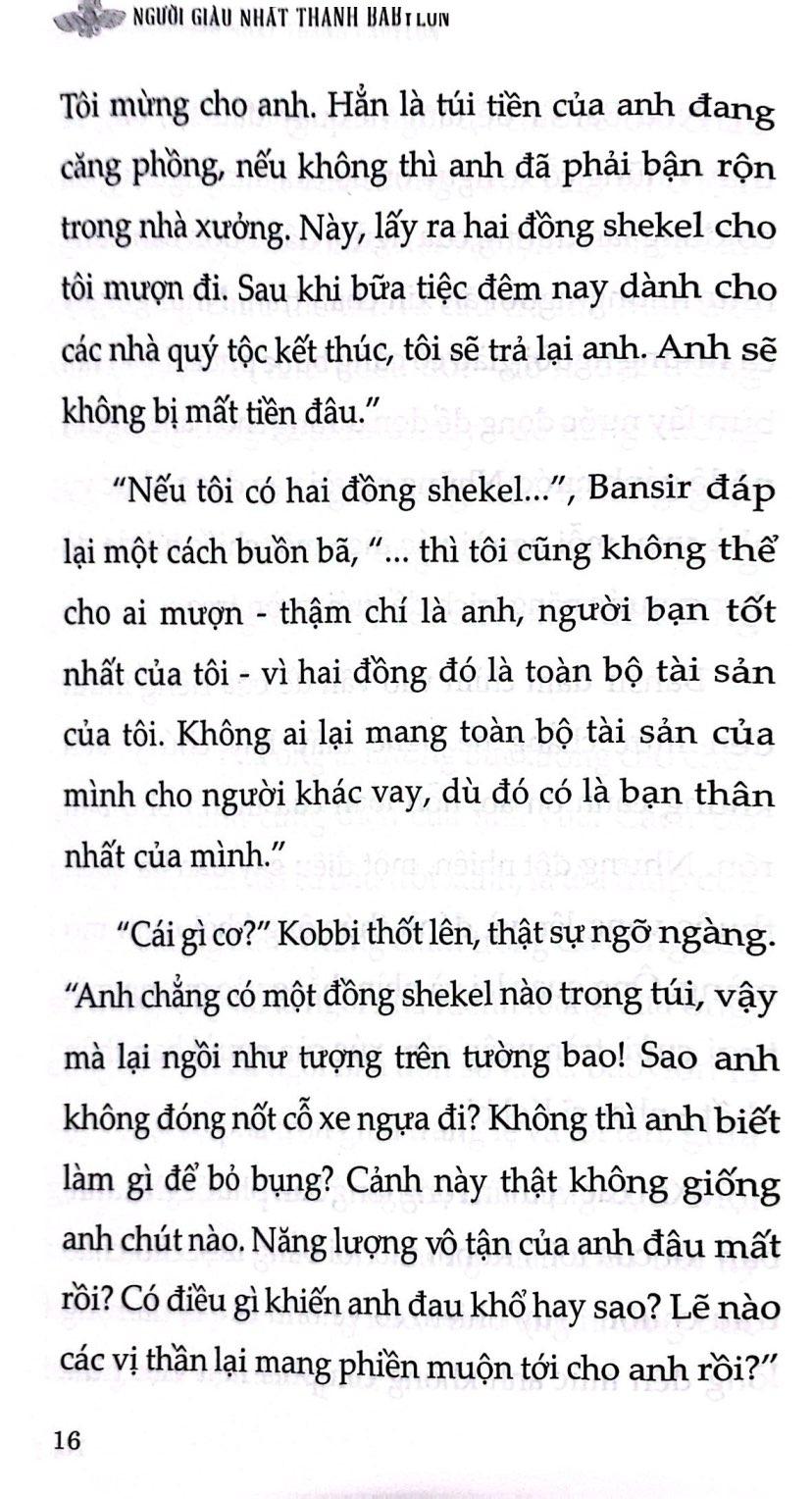 Người Babylon cổ đại là những người đầu tiên khám phá ra các quy luật để quản lý tài chính cá nhân và hướng tới cuộc sống giàu có, thịnh vượng. Trong cuốn sách kinh điển của m.ình, George S. Clason tiết lộ cho độc giả những bí quyết tài chính vĩnh cửu để tạo ra, phát triển và duy trì của cải.