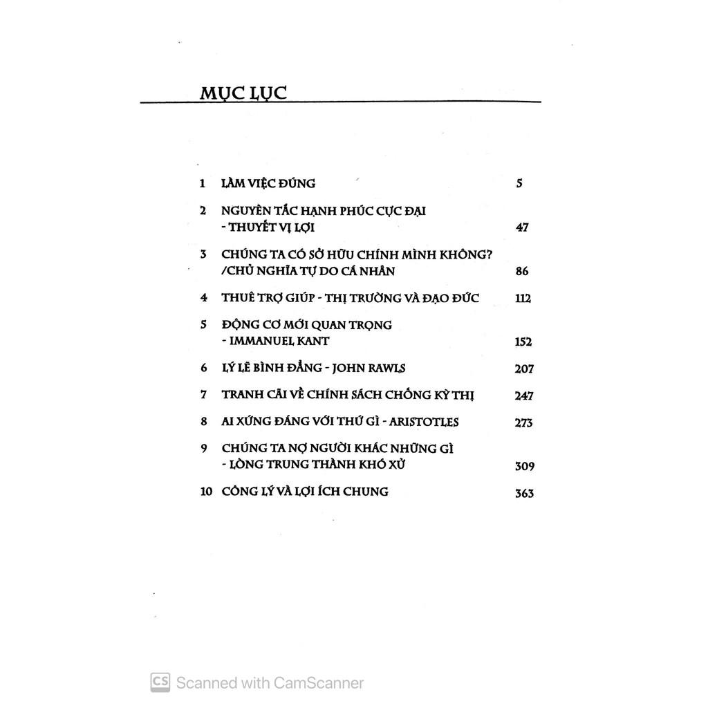 Sách bàn về vấn đề đạo đức dưới cái nhìn triết học. Tác giả đưa ra các vụ việc gây tranh cãi về vấn đề đạo đức để mổ xẻ dưới nhiều góc độ, theo quan điểm của các học thuyết triết học khác nhau, mỗi chương trình bày sâu về một học thuyết. Nhờ vậy, tư tưởng của Aristotle, Jeremy Bentham, Immanuel Kant, John Stuart Mill, Robert Nozick, và John Rawl được trình bày với sự rõ ràng và gần gũi, mà theo New York Times là "hiếm khi được giải thích dễ hiểu đến như vậy".