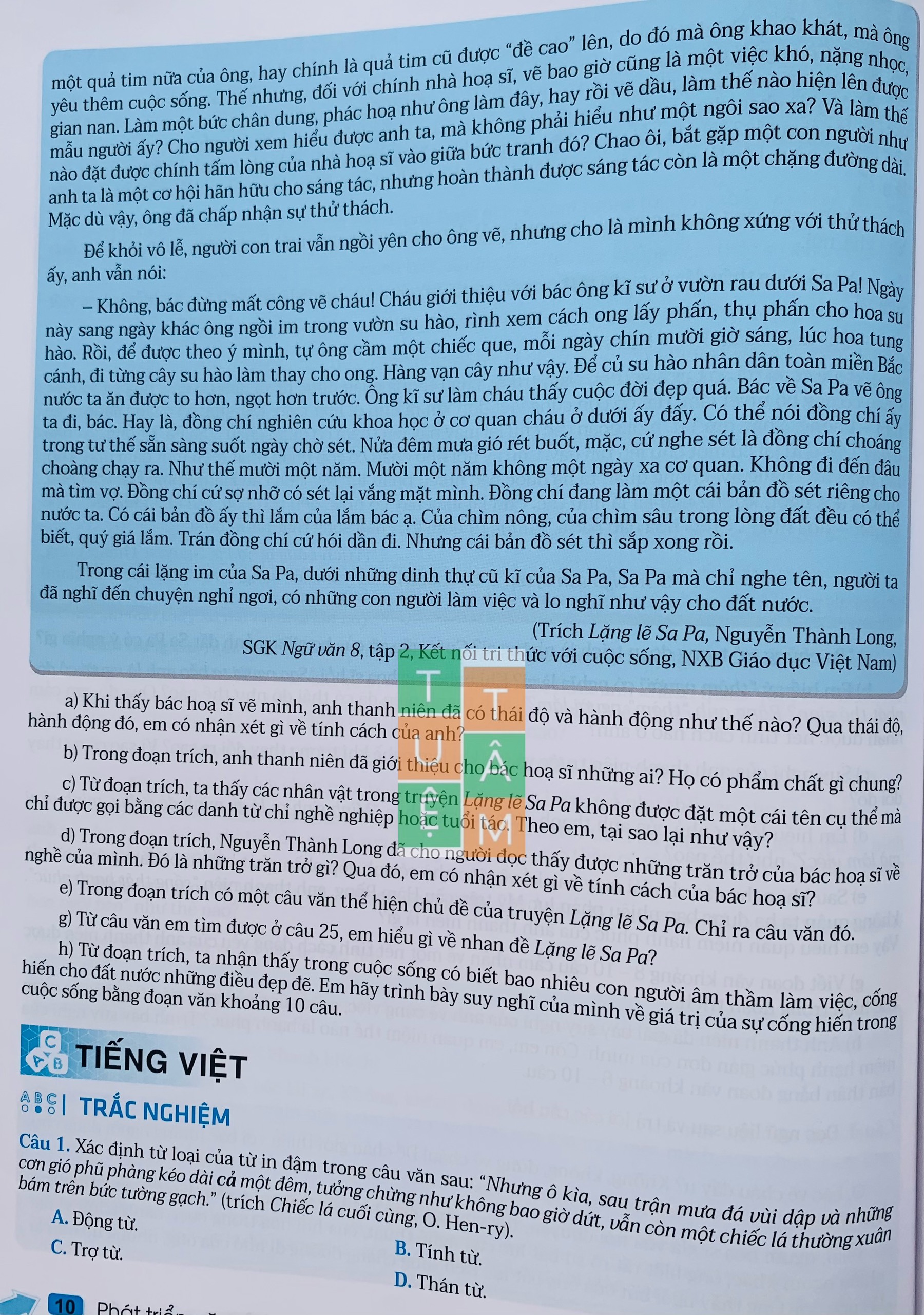 Thứ nhất, phần đọc gồm các bài tập trắc nghiệm và tự luận về các kiến thức văn bản, tiếng Việt.