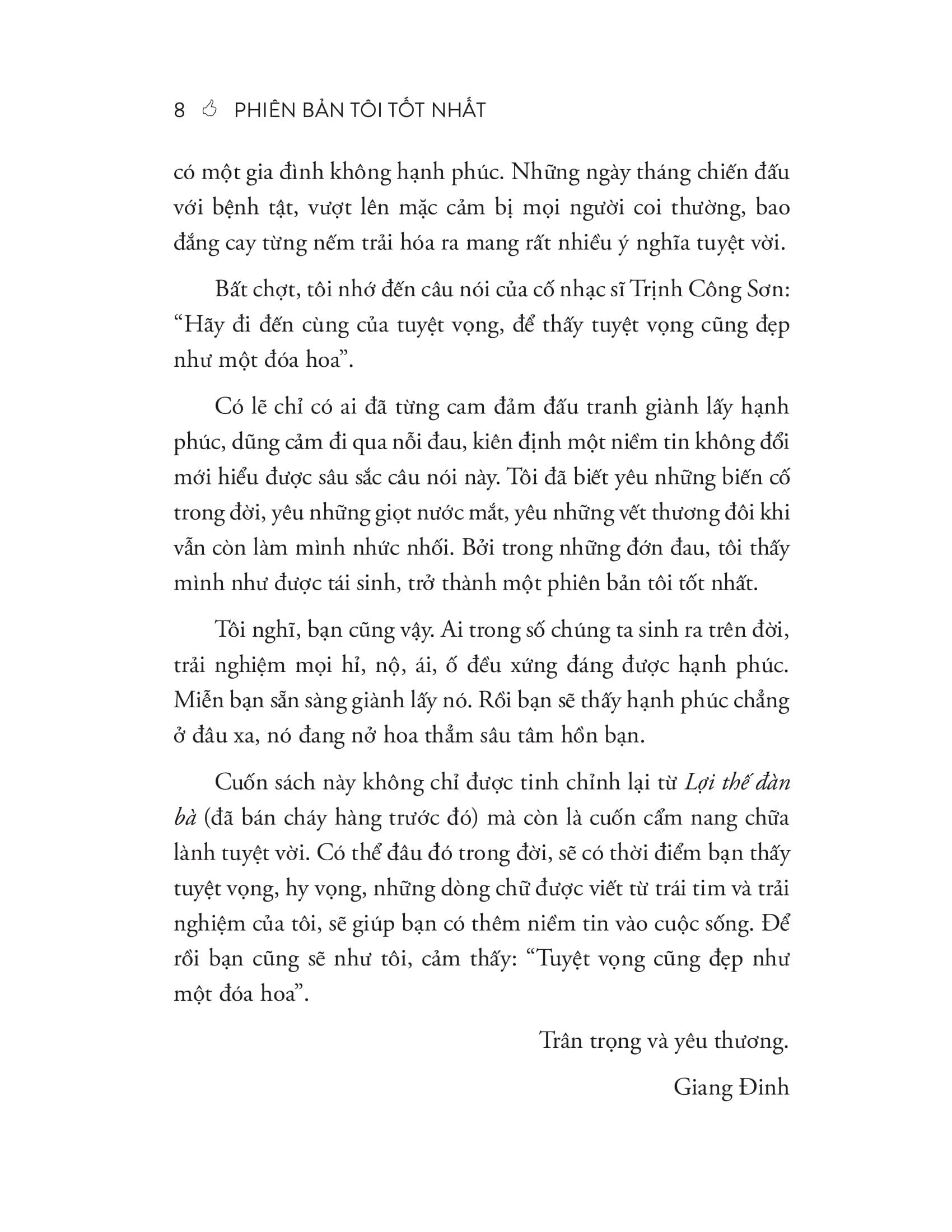 - Nếu bạn là nam giới, khi cầm trên tay cuốn sách này, bạn cũng sẽ tìm được điều gì đó thú vị, thay đổi góc nhìn của bạn, phá vỡ những định kiến quen thuộc. TÓM TẮT SÁCH Phiên bản tôi tốt nhất, được tinh chỉnh từ cuốn Lợi thế đàn bà, đổi mới và bổ sung rất nhiều nội dung giá trị, dù vẫn bám vào những câu chuyện, bài học xoay quanh người phụ nữ, nhưng nó không hẳn chỉ dành riêng cho phụ nữ. Phiên bản tôi tốt nhất dành cho bất kỳ ai muốn tìm thấy chính m.ình, hiểu rằng m.ình là người duy nhất chịu trách nhiệm cho mọi thứ đến với m.ình trong đời, nỗ lực để hoàn thiện m.ình mỗi ngày. Như mọi cuốn sách khác của Giang Đinh, Phiên bản tôi tốt nhất hướng đến thay đổi tư duy. Bởi thay đổi tư duy, bao giờ cũng thế, chính là thay đổi cuộc đời! CUỐN SÁCH CÓ GÌ ĐẶC BIỆT