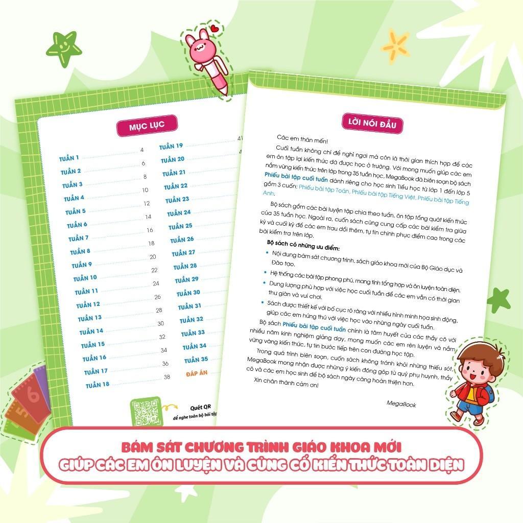 Mua tại TiktokCuối tuần không chỉ để nghỉ ngơi mà còn là thời gian thích hợp để các con ôn tập lại kiến thức đã được học ở trường. Với mong muốn giúp các con nắm vững kiến thức trên lớp trong 35 tuần học, MegaBook đã biên soạn bộ sách Phiếu bài tập cuối tuần dành riêng cho học sinh tiểu học từ lớp 1 đến lớp 5 với bộ 3 cuốn: Phiếu bài tập Toán, Phiếu bài tập Tiếng Việt, Phiếu bài tập Tiếng Anh. Bộ sách gồm các bài luyện tập chia theo tuần, ôn tập tổng quát kiến thức của 35 tuần học. Ngoài ra, cuốn sách cũng cung cấp các bài kiểm tra giữa kỳ và cuối kỳ để các con trau dồi thêm, tự tin chinh phục điểm cao trong các bài kiểm tra trên lớp. ƯU ĐIỂM CỦA CUỐN SÁCH PHIẾU BÀI TẬP CUỐI TUẦN TIẾNG 4: