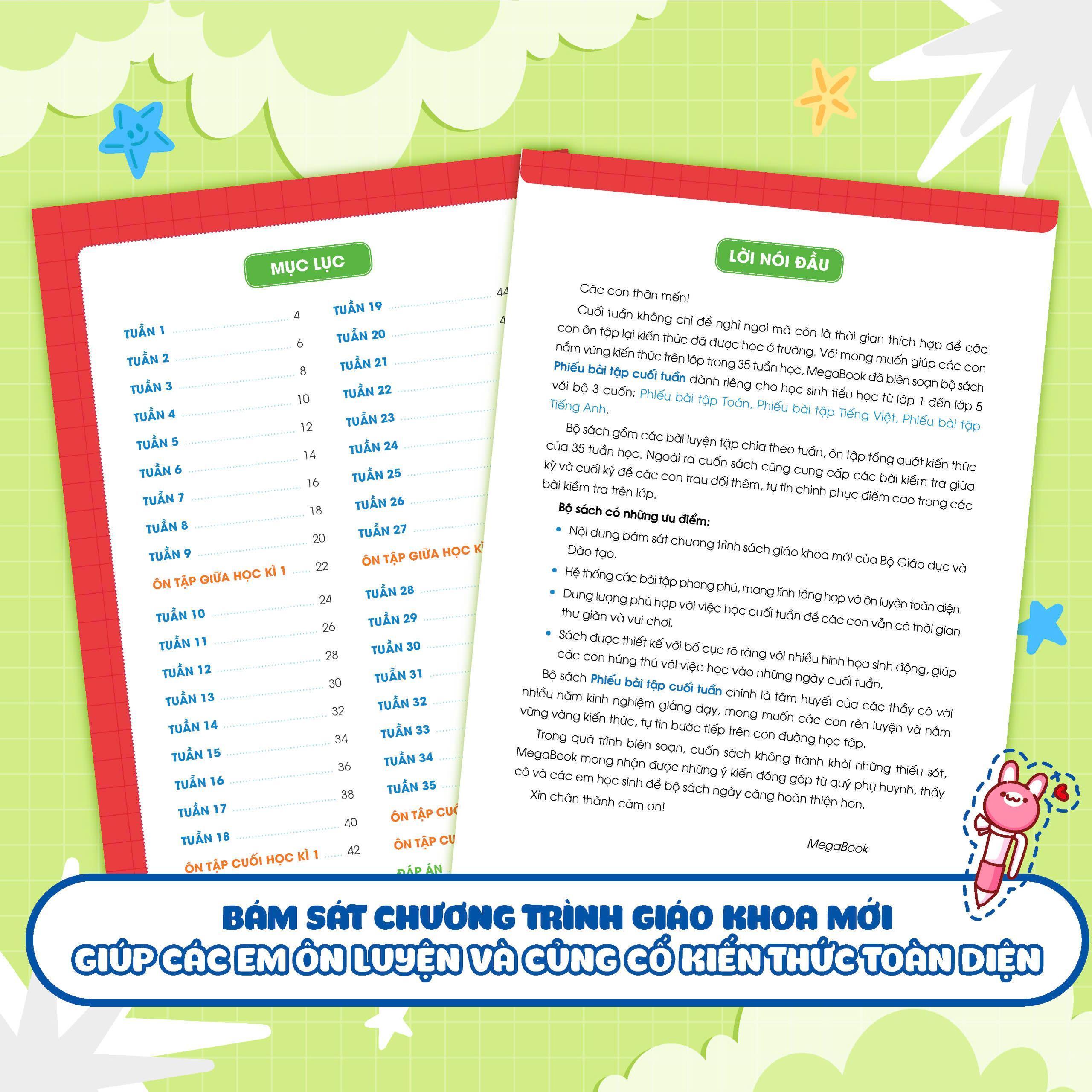 Cuối tuần không chỉ để nghỉ ngơi mà còn là thời gian thích hợp để các con ôn tập lại kiến thức đã được học ở trường. Với mong muốn giúp các con nắm vững kiến thức trên lớp trong 35 tuần học, MegaBook đã biên soạn bộ sách Phiếu bài tập cuối tuần dành riêng cho học sinh tiểu học từ lớp 1 đến lớp 5 với bộ 3 cuốn: Phiếu bài tập Toán, Phiếu bài tập Tiếng Việt, Phiếu bài tập Tiếng Anh.